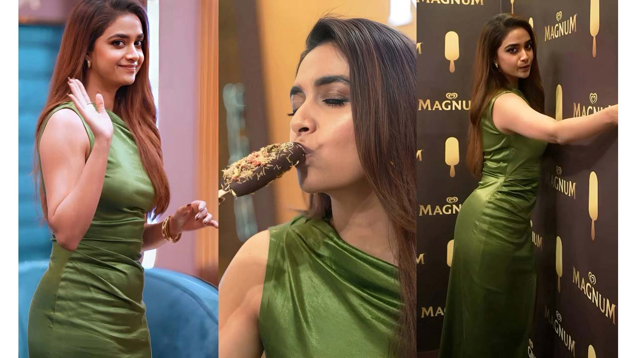 Keerthy suresh looks so hot in green sleeveless side slit gown..