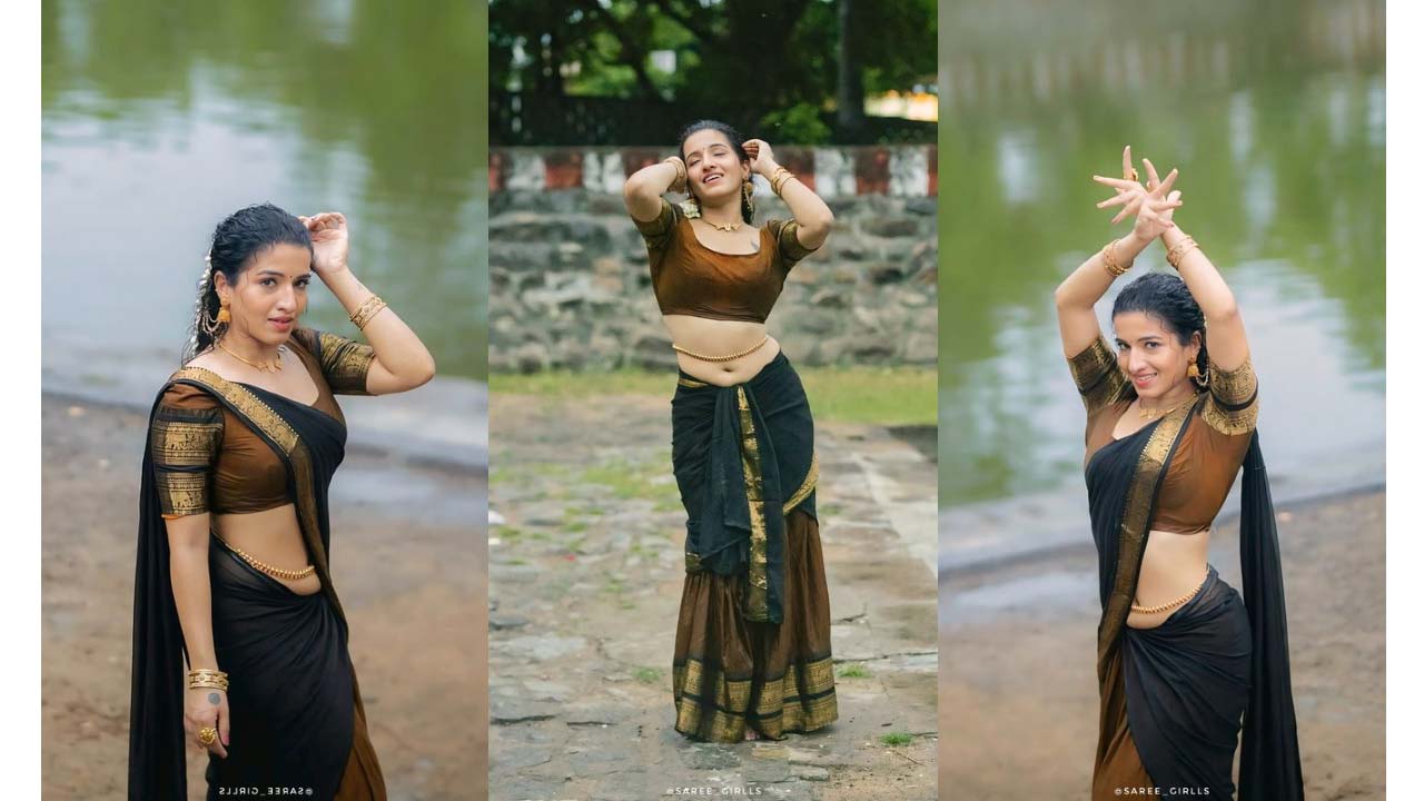 Mirchi kemy pond side hot photos in brown dhavani..