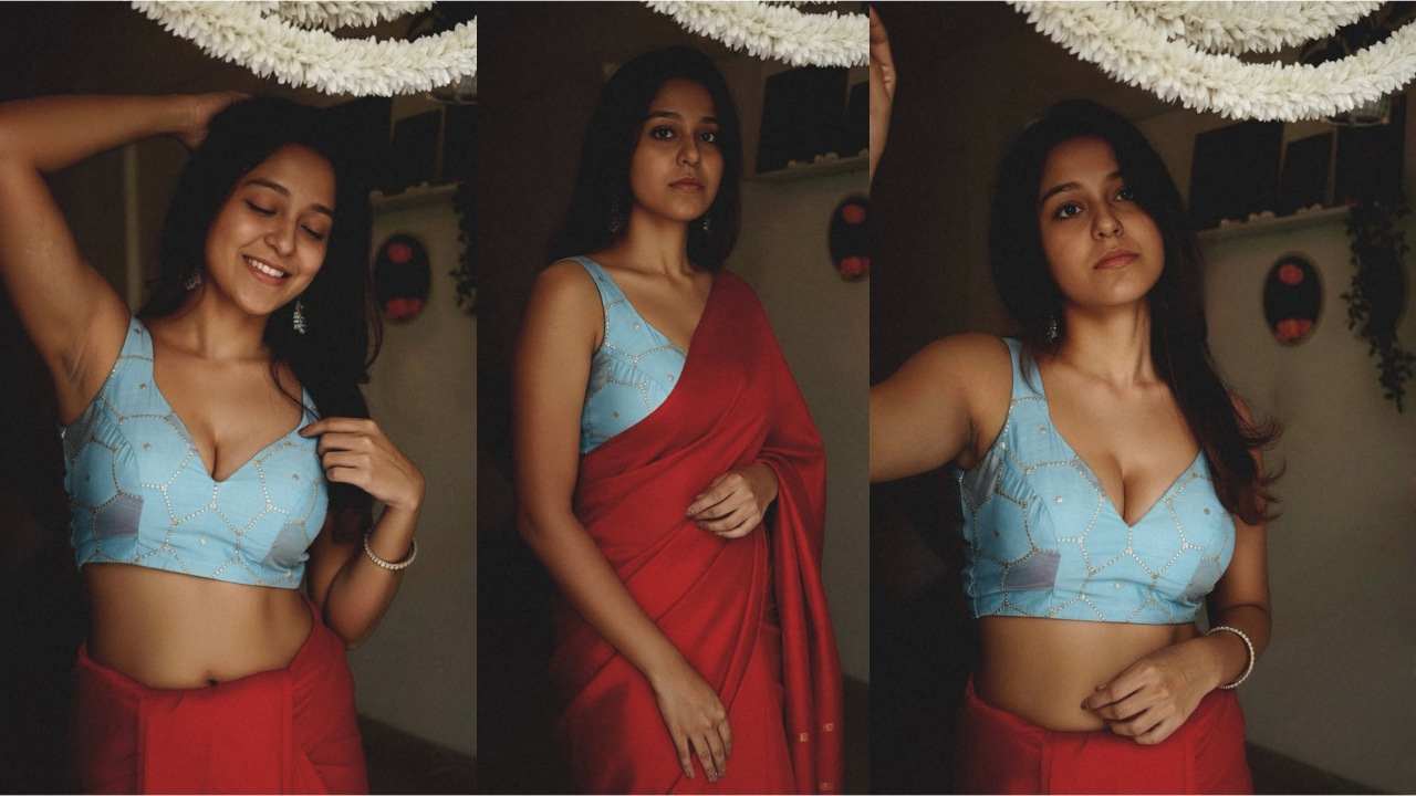 Shruthi ragunanthan stripes her saree to tempt her fans.