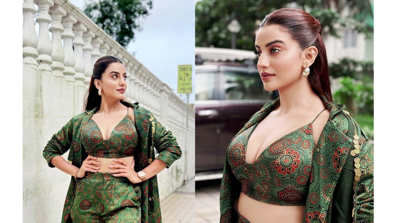 Akshara singh looks gorgeous in bralette top phant and shrug.