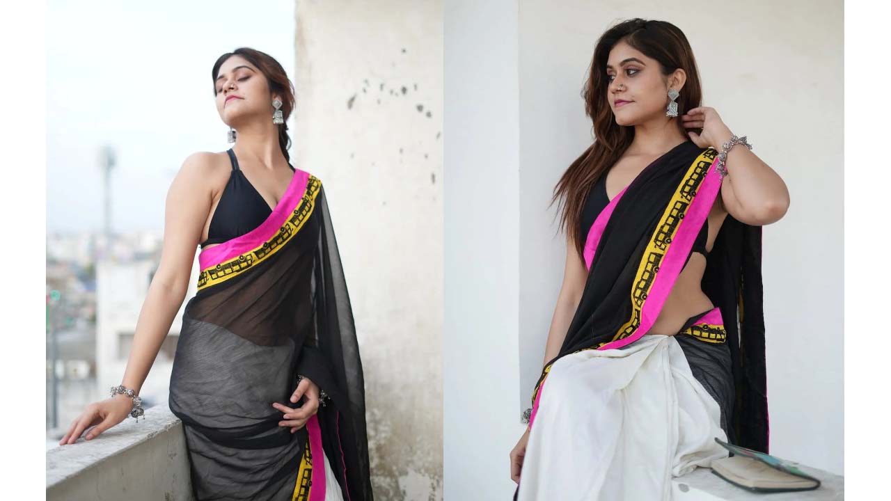 Mannat Chaudhary strikes hot poses in a black transparent saree.