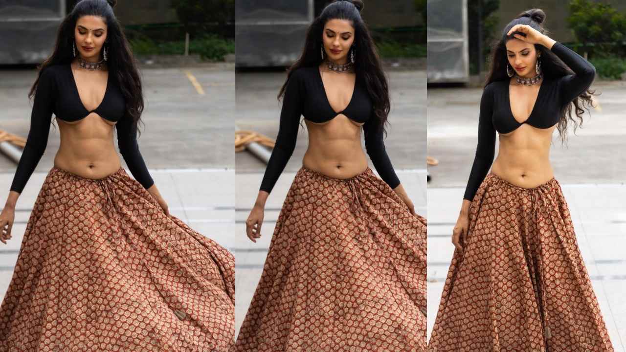 Priyanka kholgade tempting pose in bralette top and full skirt.