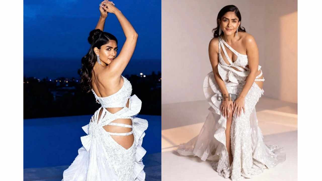 Mrunal thakur poses hot in spicy ripped side slit gown.