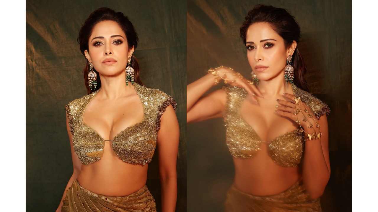 Nushrratt bharuccha spicy cleavage exposed in golden bralette top.