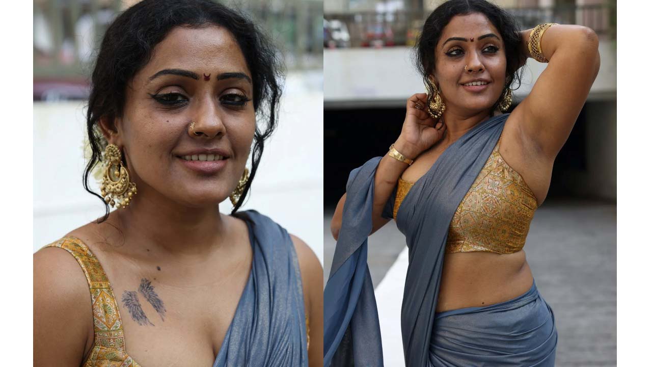 Lakshu raghav hot cleavage exposed in bare back sleeveeless saree..