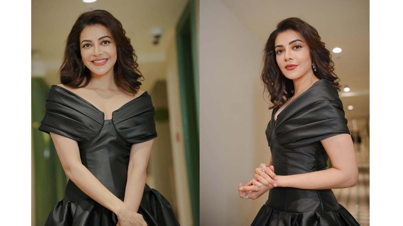 Kajal aggarwal looks cute in a black butterfly gown..