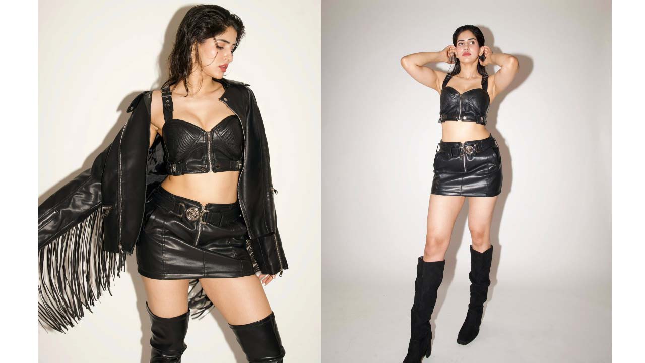 Sakshi malik sizzles in black leather bralette top and mini skirt.