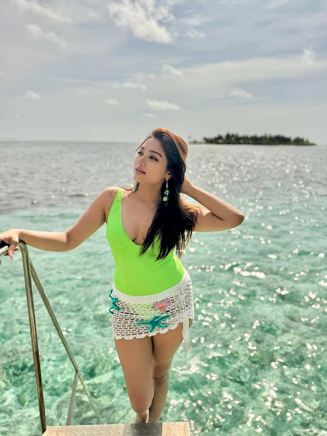 Aishwarya Devan, age 31, a South Indian film actress and model who was born and raised in Thrissur, Kerala. Actress Aishwarya Devan, who went to the Maldives to celebrate her vacation, has clicked some very glamorous photos in a green swimsuit at a beach resort there. Guys, here are some of these hot photos of actress Aishwarya Devan, which are a feast for the eyes of u guys.. Enjoy her hotness dudes.