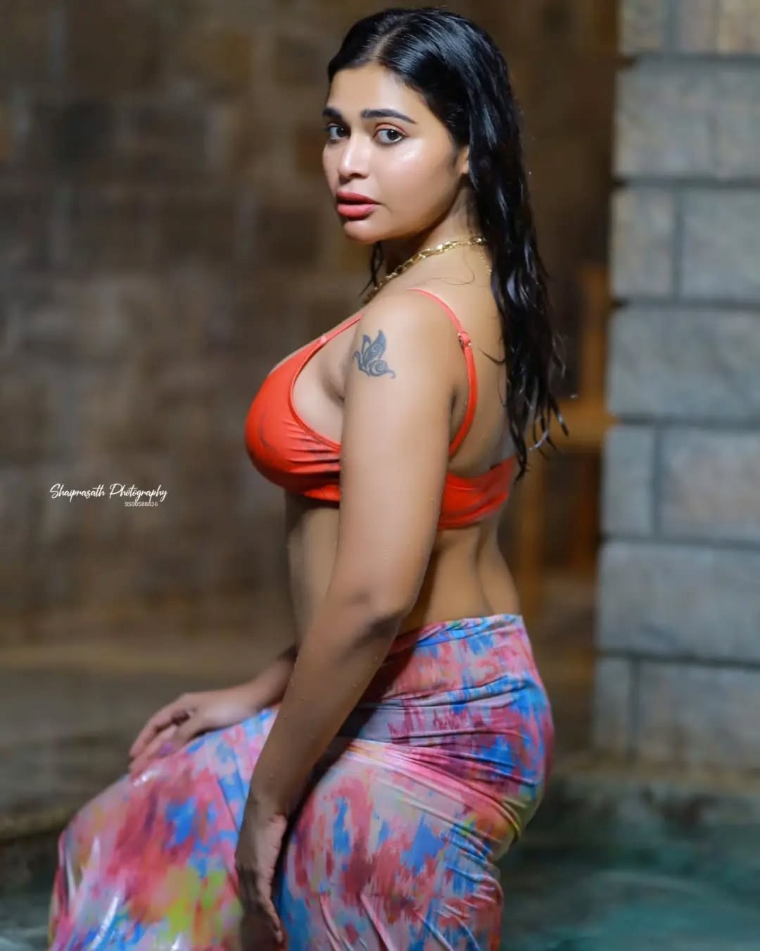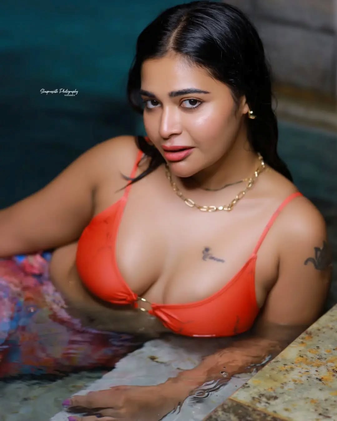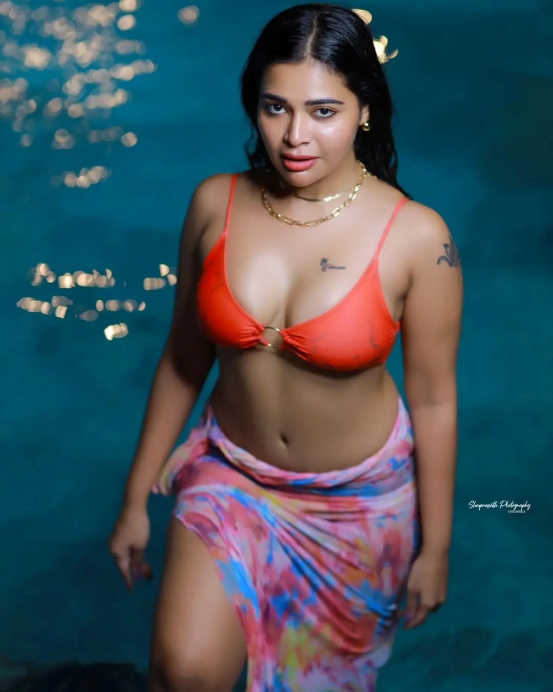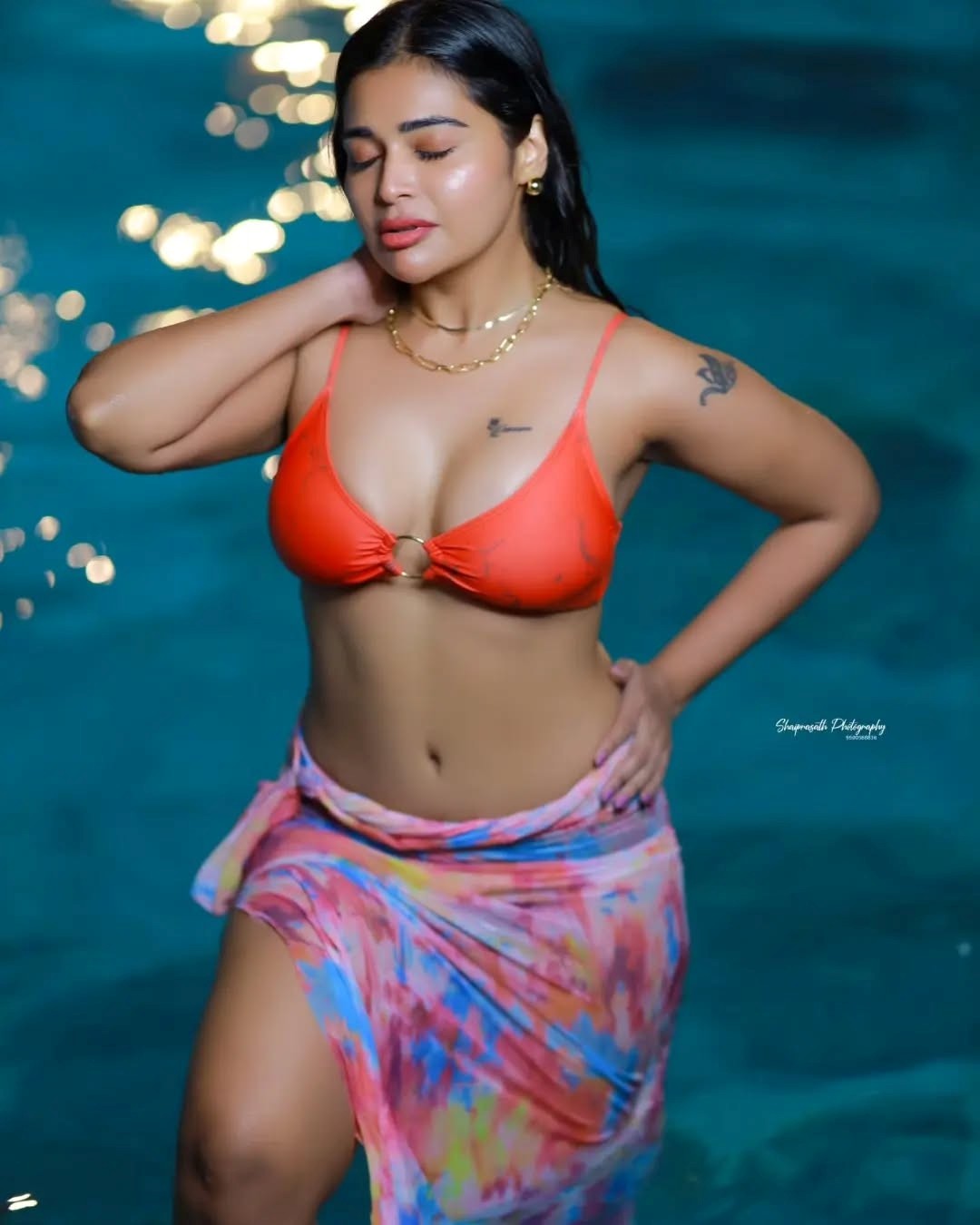 Darsha gupta, age 31, born and raised in coimbatore, is one of the gorgeous and hot tamil actress and model. Few days ago, darsha gupta clicked her spicy orange bikini swimming pool photos. In these hot bikini photos, darsha gupta exposed her busty navel and cleavage to her fans. Enjoy these gorgeous bikini photos of actress darsha gupta here guys.