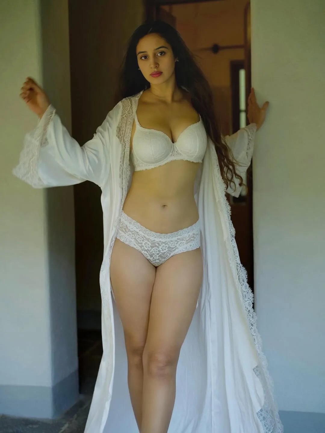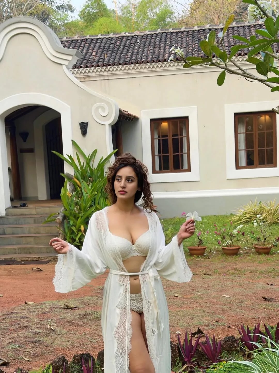Shivani kashmiri, a cute & gorgeous insta star, youtuber and digital content creator. She is a RCB fan girl, and become popular after posting challenge based posts about RCB team performances in IPL. recently shivani kashmiri poses hot in a white two piece bikini suit with a transparent white shrug. Shivani flaunted her toned physique and hot assets in these photos to mesmerize her fans. Enjoy these hot white two piece bikini photos of shivani kashmiri here guys.