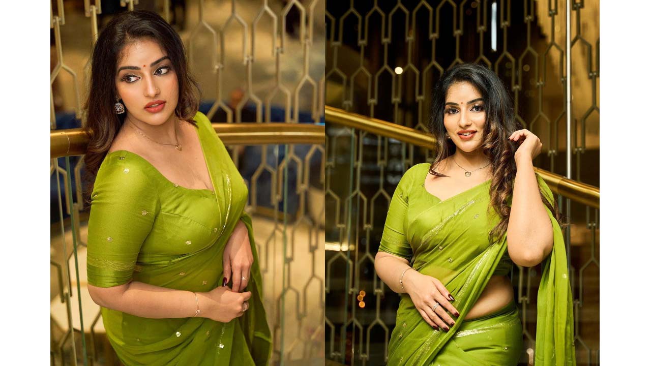 Malavika menon looks gorgeous in green transparent saree..