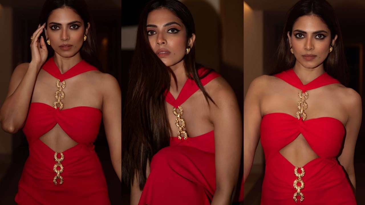 Malavika Mohanan striking a hot pose in a glamorous red outfit.