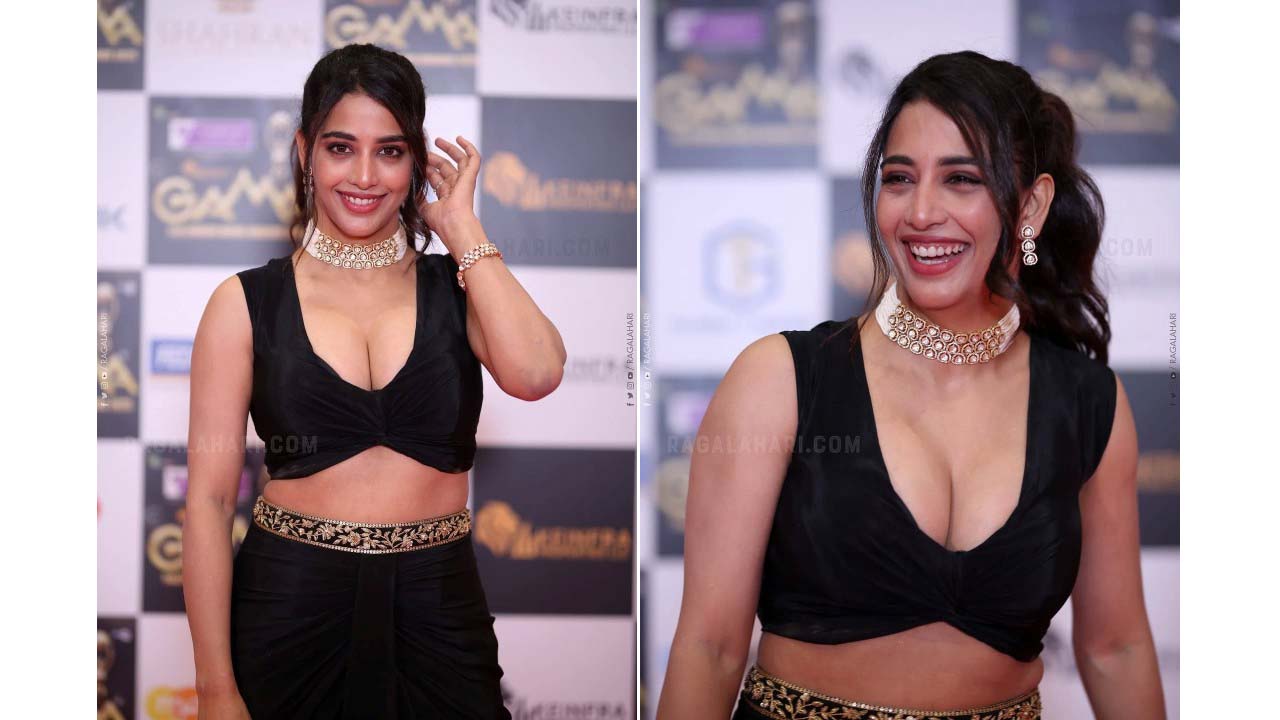 Daksha nagarkar hot pose in low neck black bralette top..