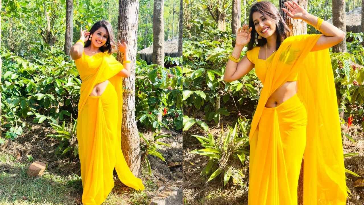 Priya hegde super hot outdoor yellow saree photoshoot..