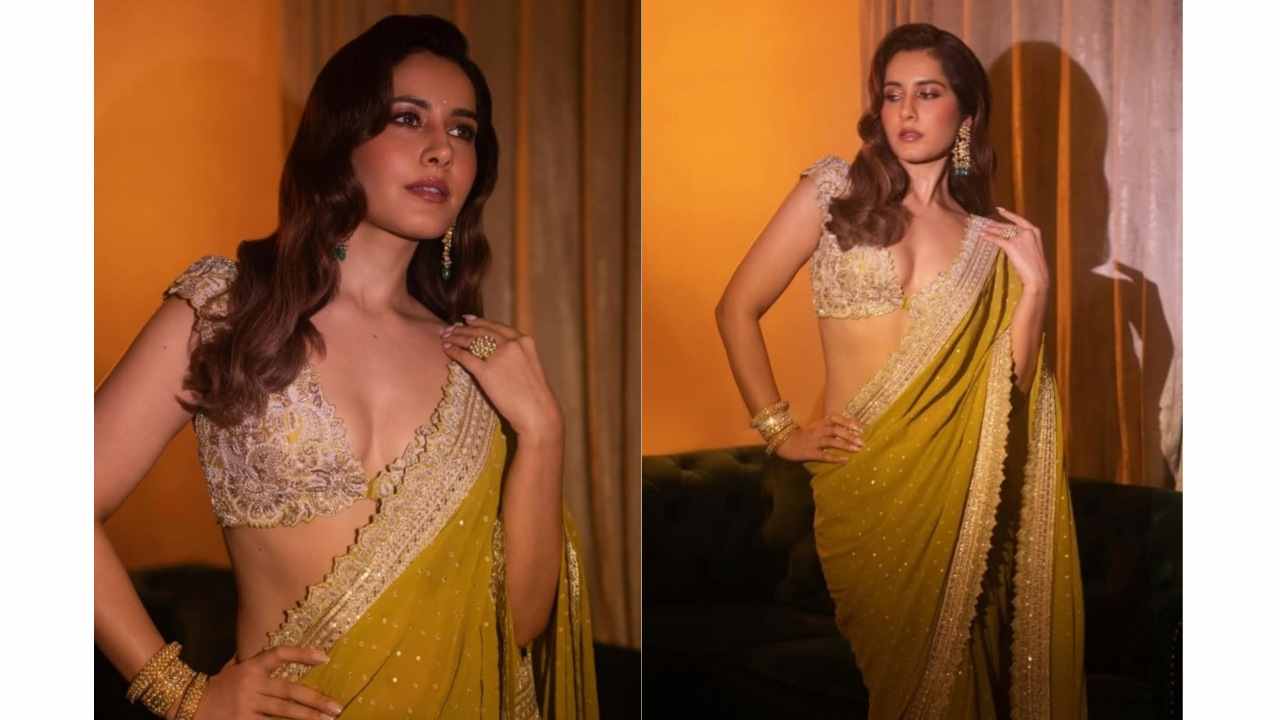 Rashi Khanna giving hot poses in bikini blouse and saree.