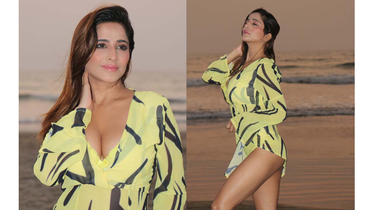 Kate Sharma flaunts her cleavage in a low-neck outfit at the beach.