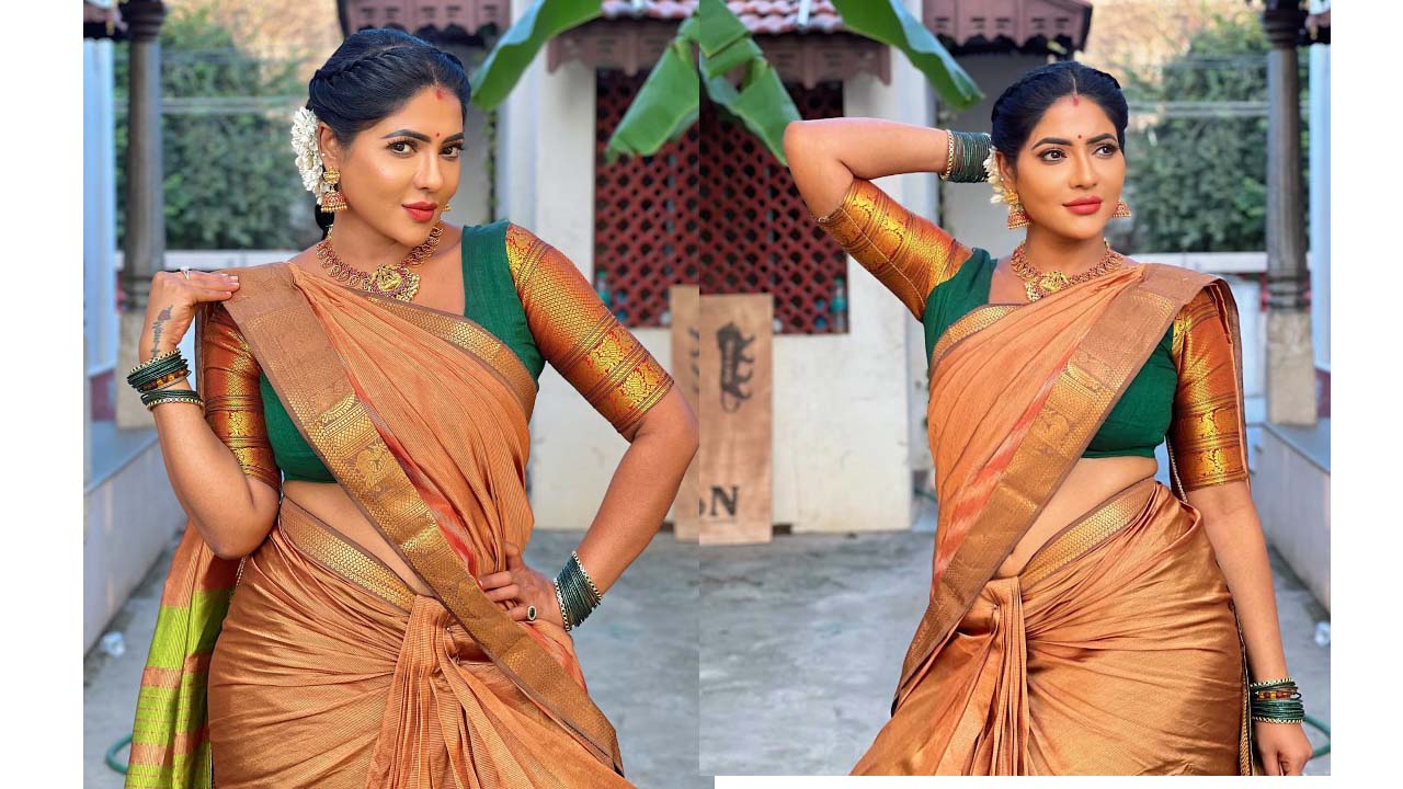Reshma Pasupuleti looks like a sandal wood carved beauty in an orange saree..