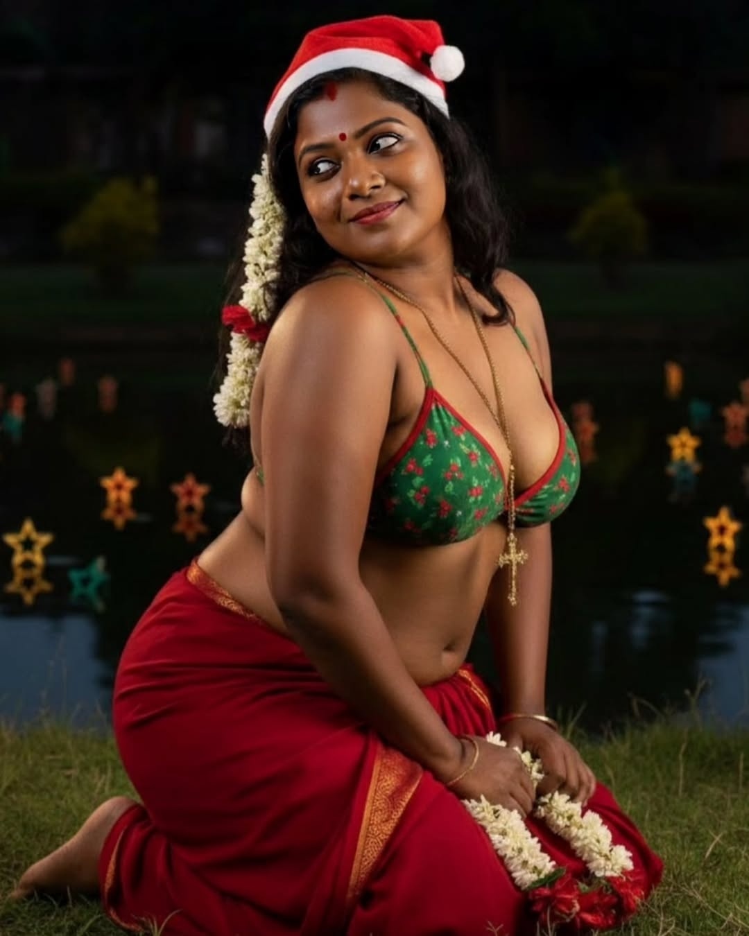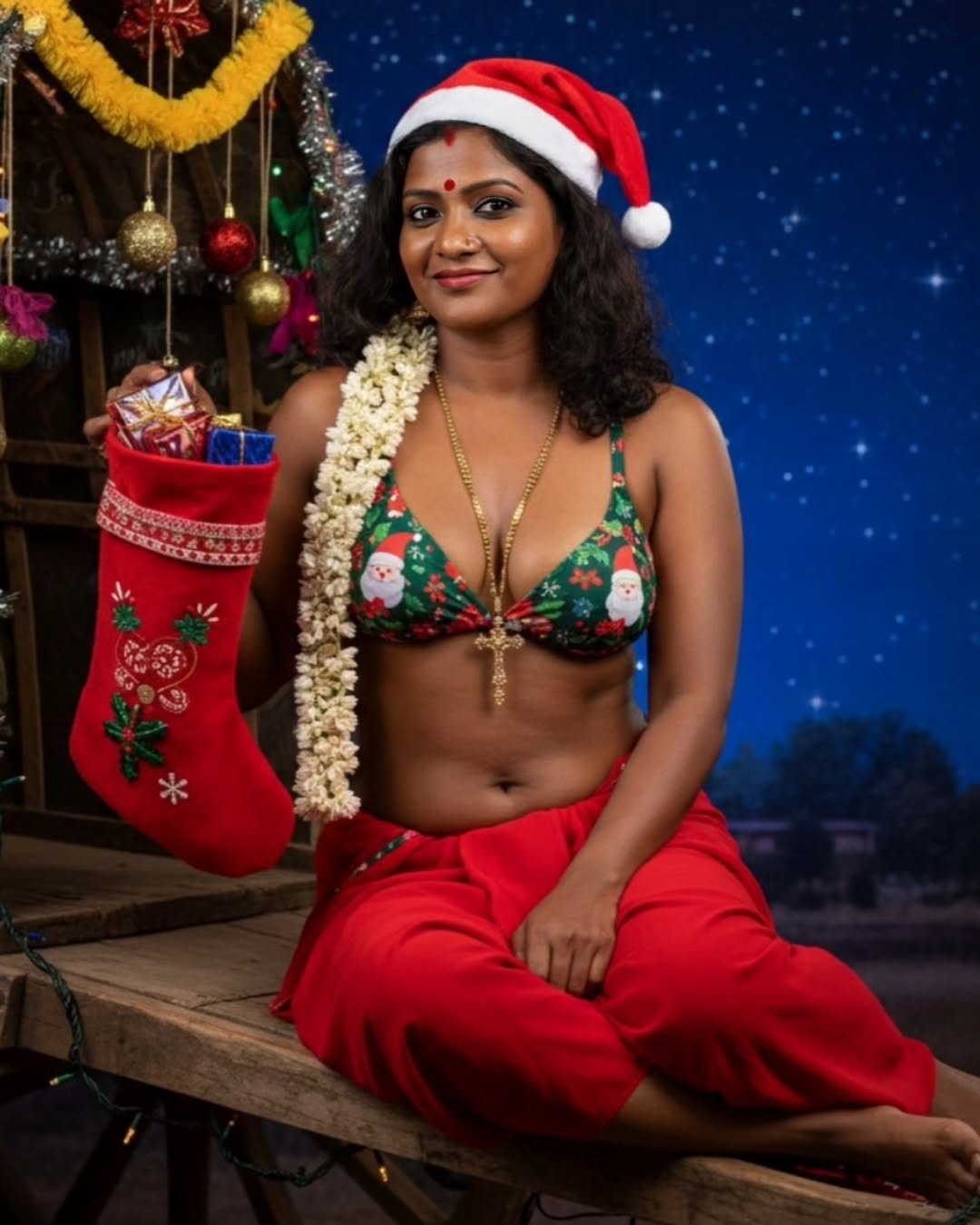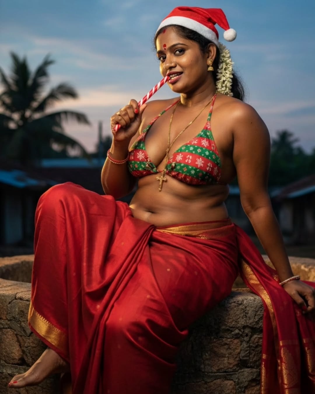 Yesterday when i surf insta pages, i found some hot AI generated tamil aunty dressed up in a bikini top and red saree with a christmas santa cap in head. These ai generated tamil village aunty christmas photos looks very hot and spicy bu exposing chubby dusky navel to her fans. I want to share these hot tamil village aunty ai generated christmas photos with u friends. So i posted these hot ai generated photos here for your viewing pleasure.friends…