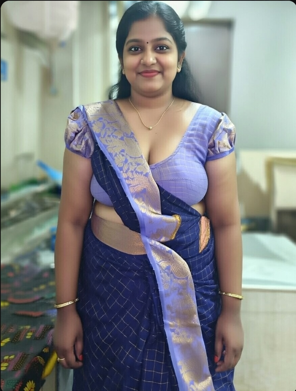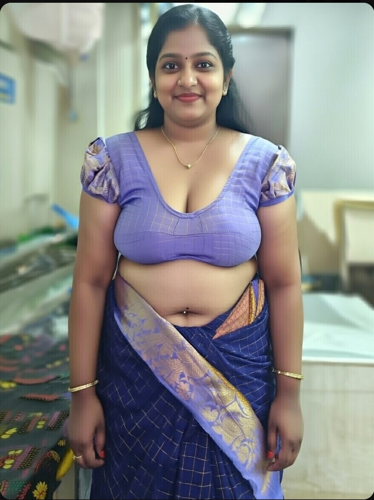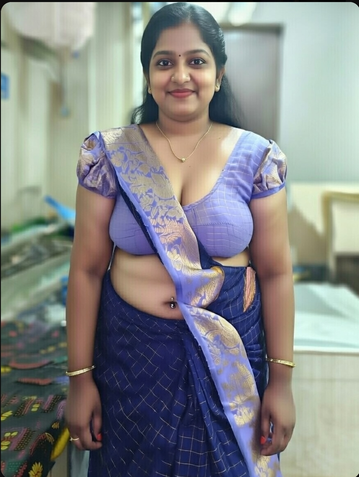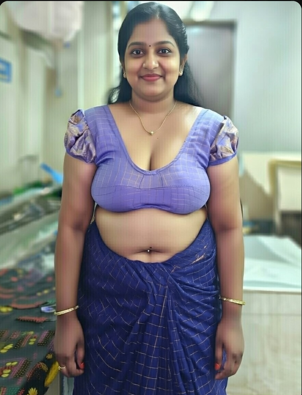 A cute tamil aunty in blue saree ai generated photos. In this ai generated photos, the aunty drags her saree slightly and exposing her chubby navel, thoppul & cleavage. I got this ai photos from net and posting here. Enjoy these hot photos of ai generated tamil aunty in blue blouse and saree. Enjoy her navel and cleavage friends.