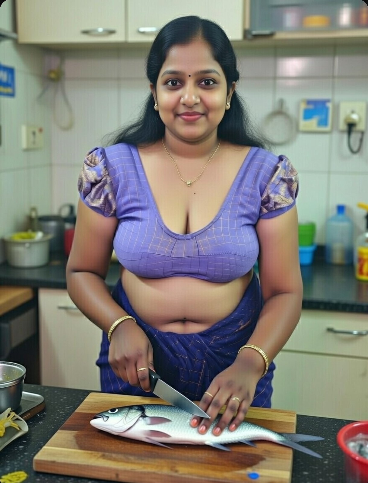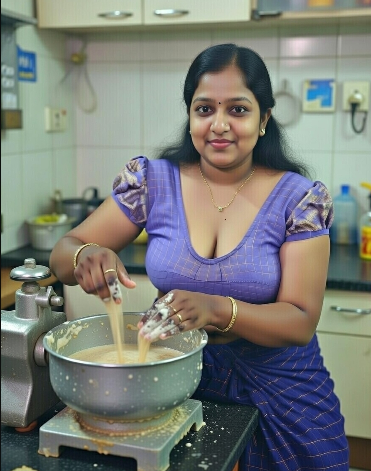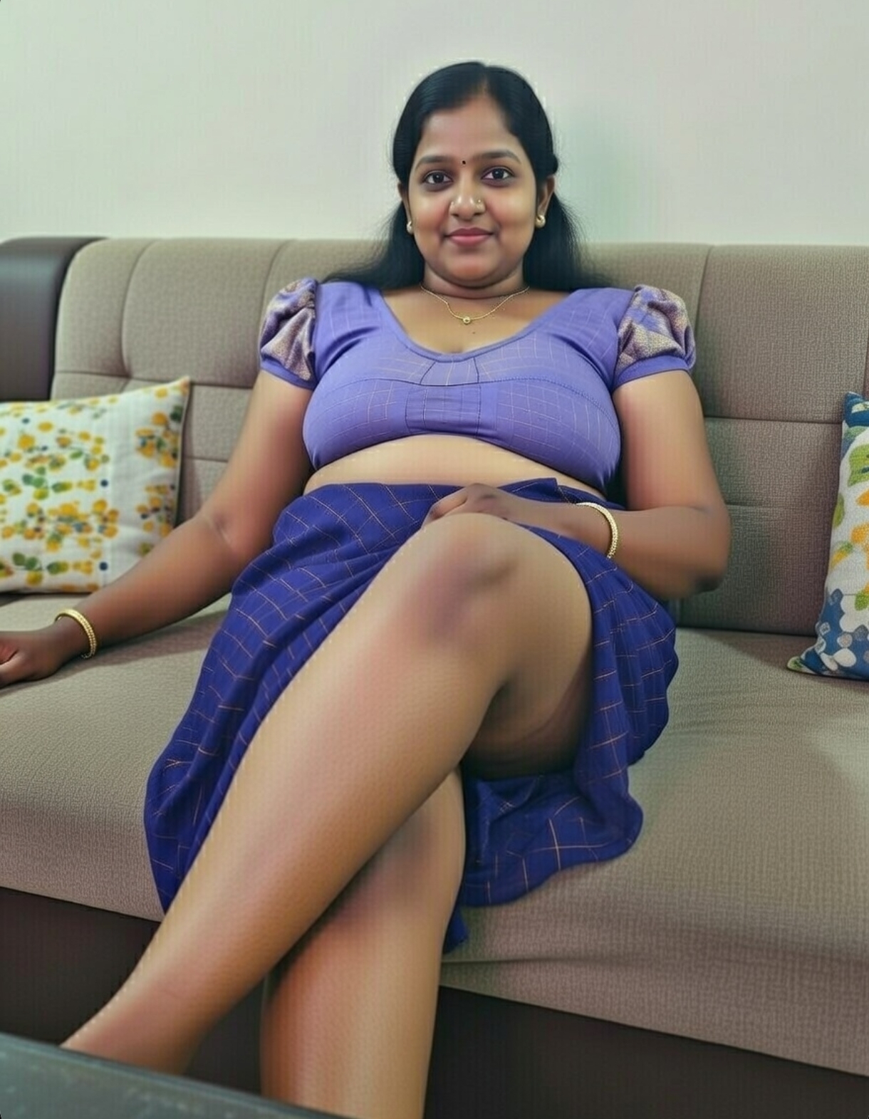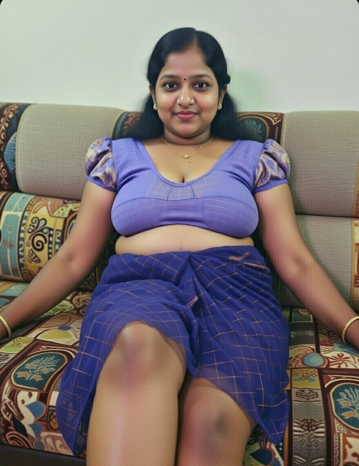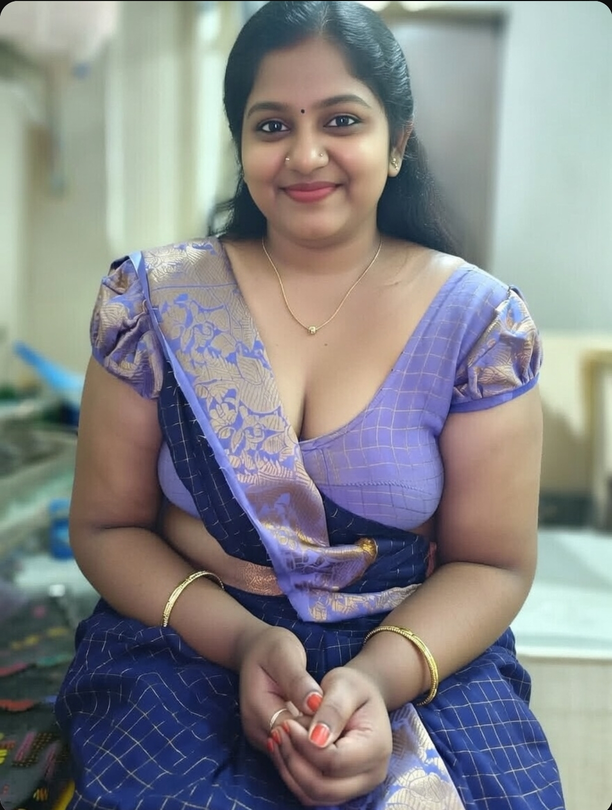 A cute tamil aunty in blue saree ai generated photos. In this ai generated photos, the aunty drags her saree slightly and exposing her chubby navel, thoppul & cleavage. I got this ai photos from net and posting here. Enjoy these hot photos of ai generated tamil aunty in blue blouse and saree. Enjoy her navel and cleavage friends.