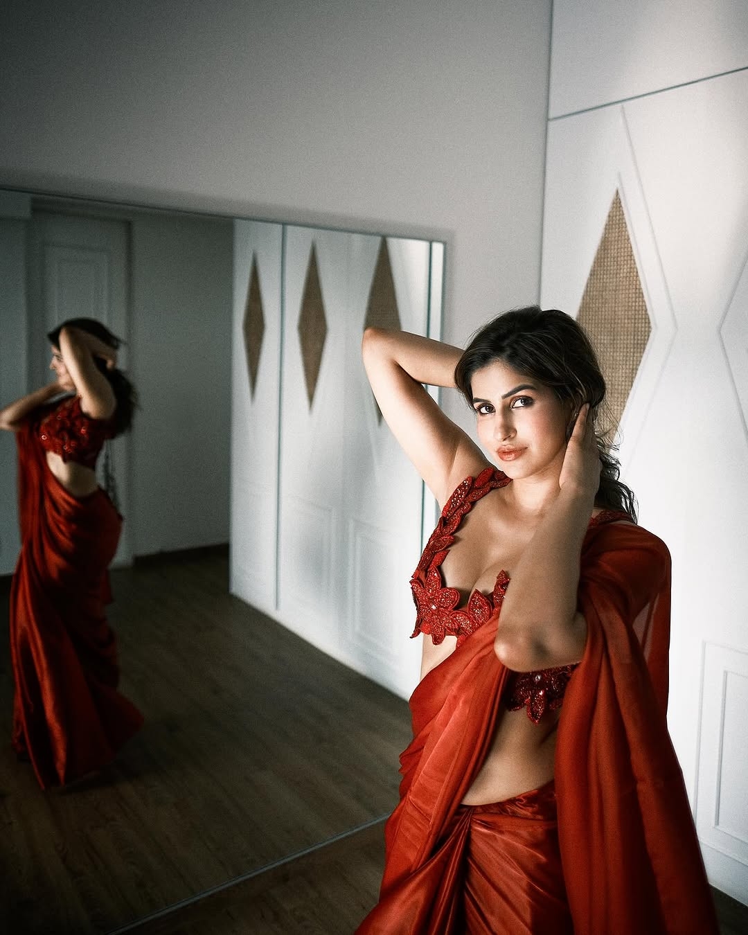 Sakshi malik, age 32, born and raised up in kanpur, is one of the gorgeous bollywood actress, fitness influencer and model. Recently sakshi malik clicked her breathtaking photos in a spicy deep low neck red saree, exposing her silky navel & cleavage to her fans. Get ready to witness these gorgeous saree photos of sakshi malik here guys.