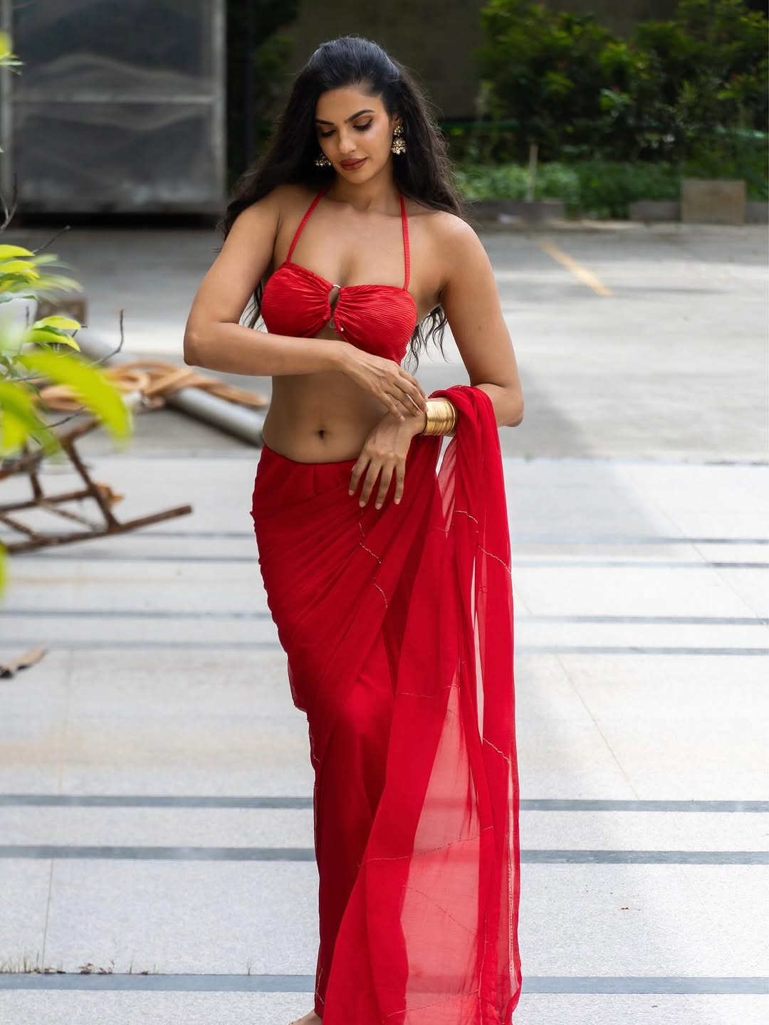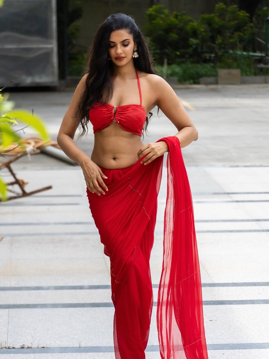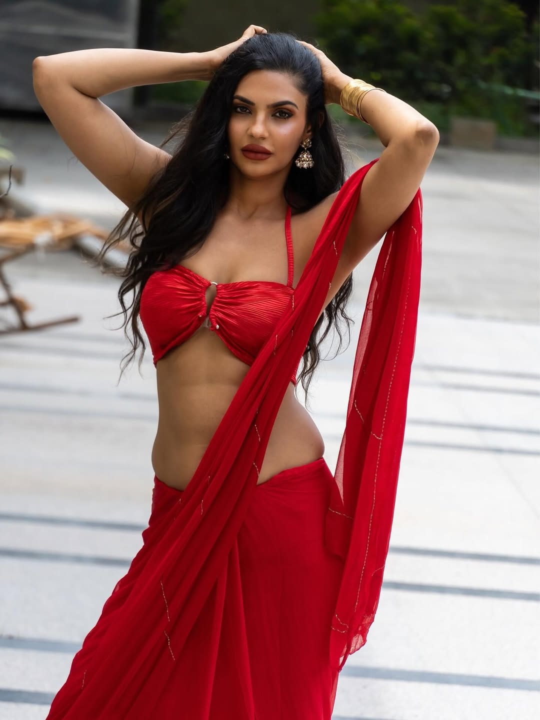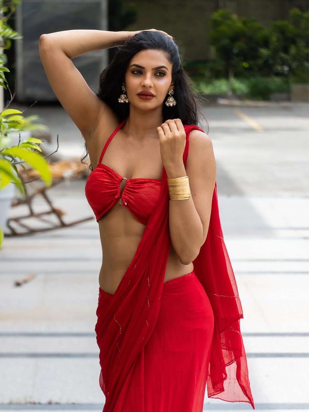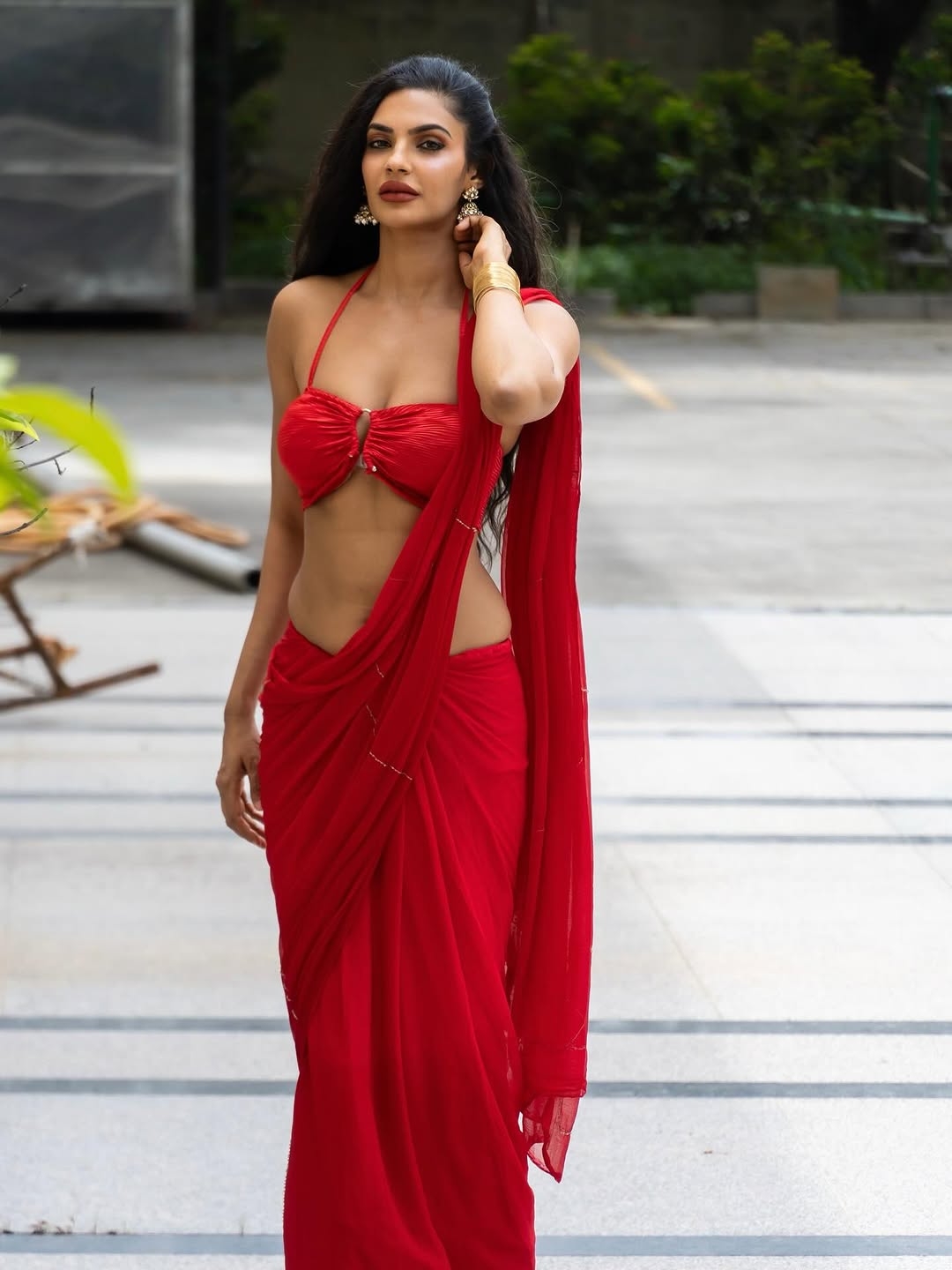 Manmeet kaur, age 28, born and raised up in mumbai, is one of the gorgeous bollywood actress and model. In her recent photoshoot, manmeet kaur posed hot in a sleeveless red saree. In this photoshoot, manmeet kaur slightly draped her saree to expose her silky navel to her fans. Enjoy these gorgeous saree photos of actress manmeet kaur. Here lemme post these spicy saree photos of manmeet kaur. Enjoy her hotness guys.