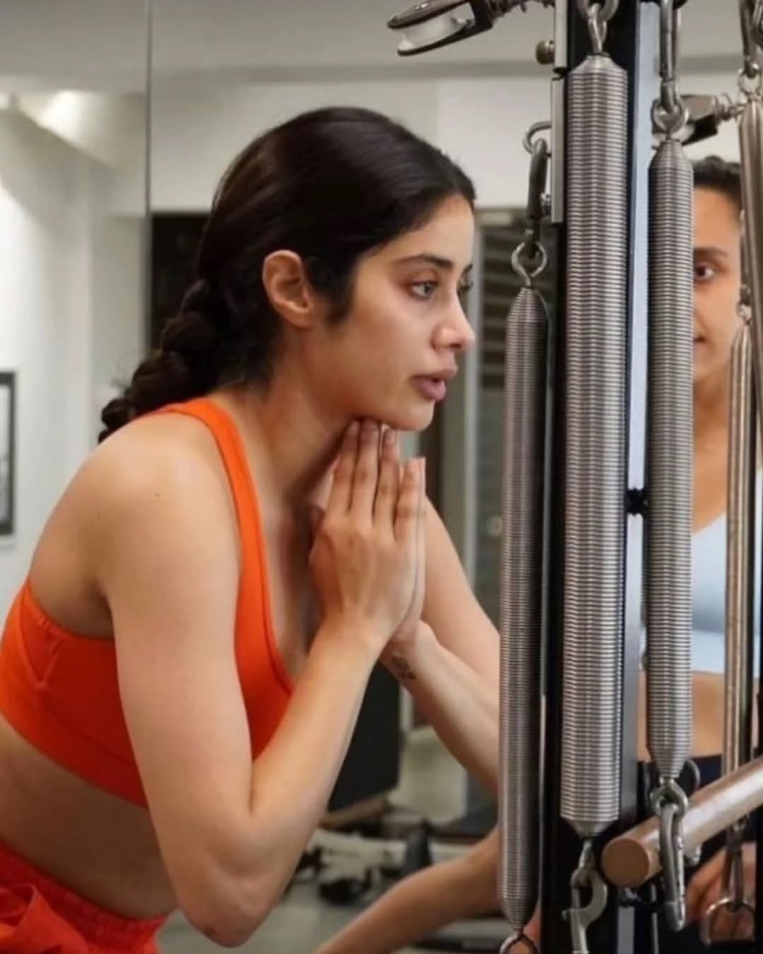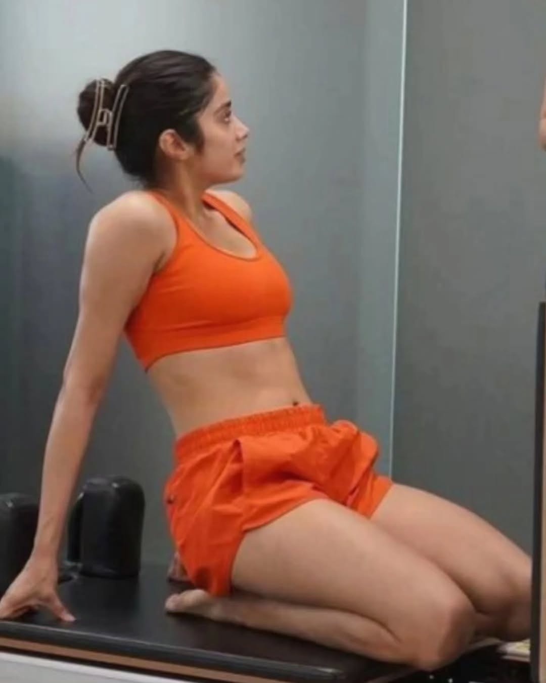 3448010cookie-checkJanhvi kapoor doing workout in orange bralette top and matching shorts..