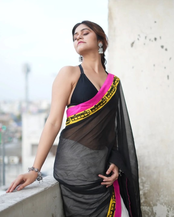 Mannat Chaudhary strikes hot poses in a black transparent saree.