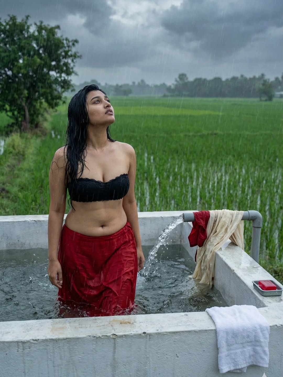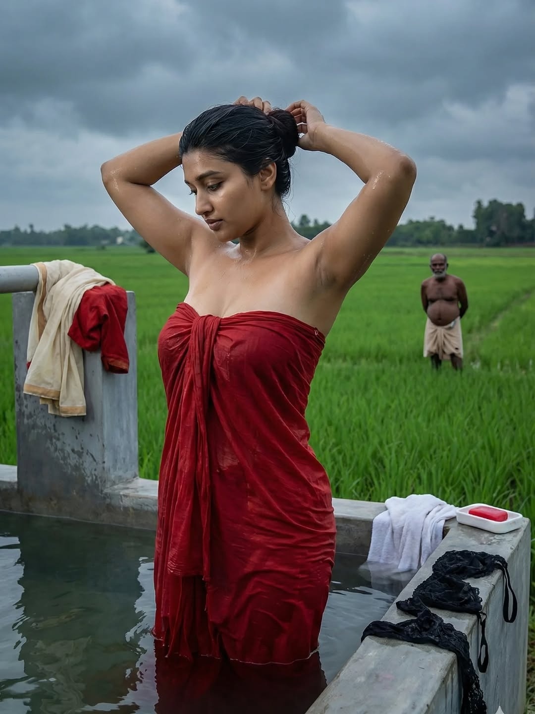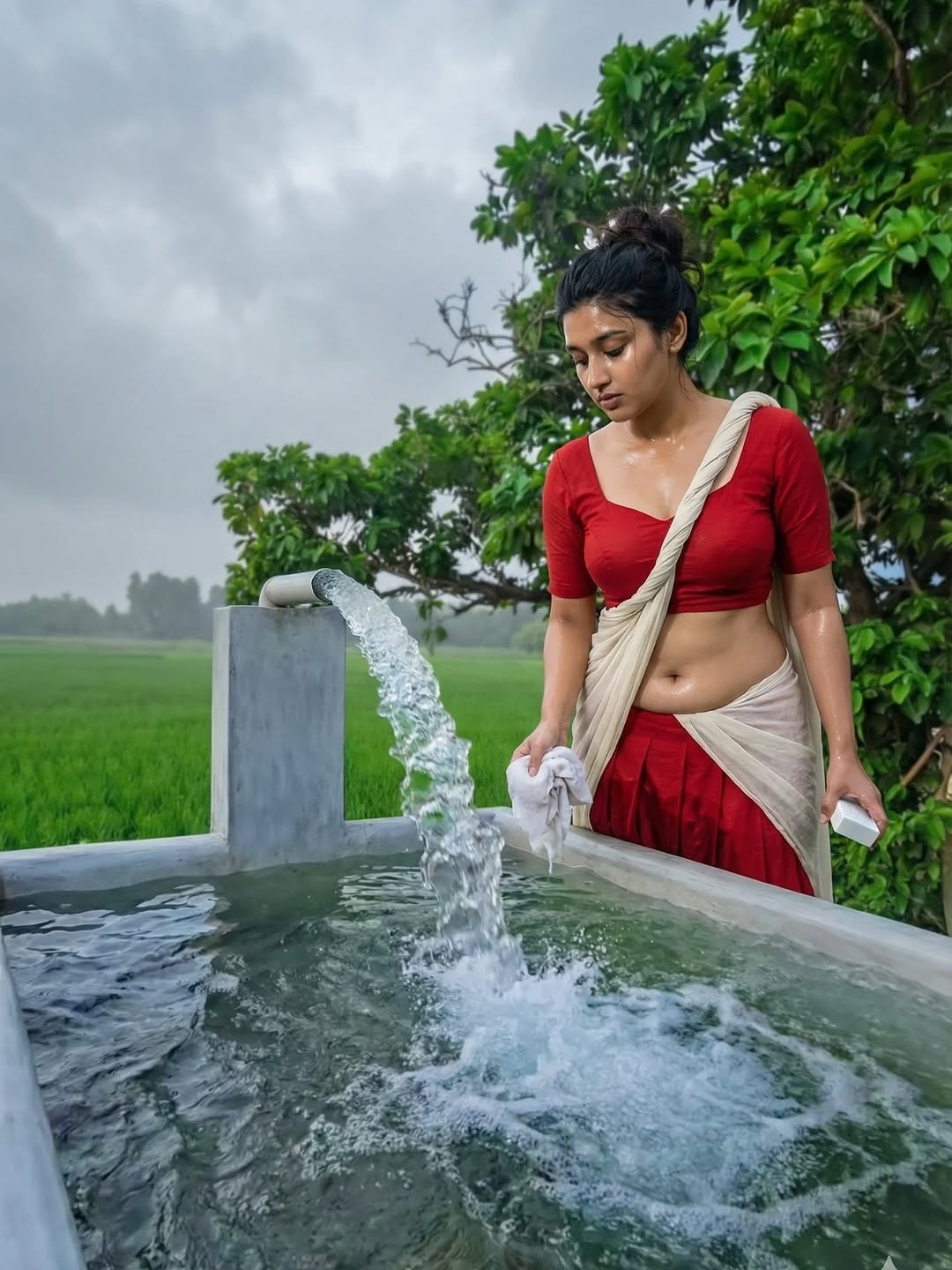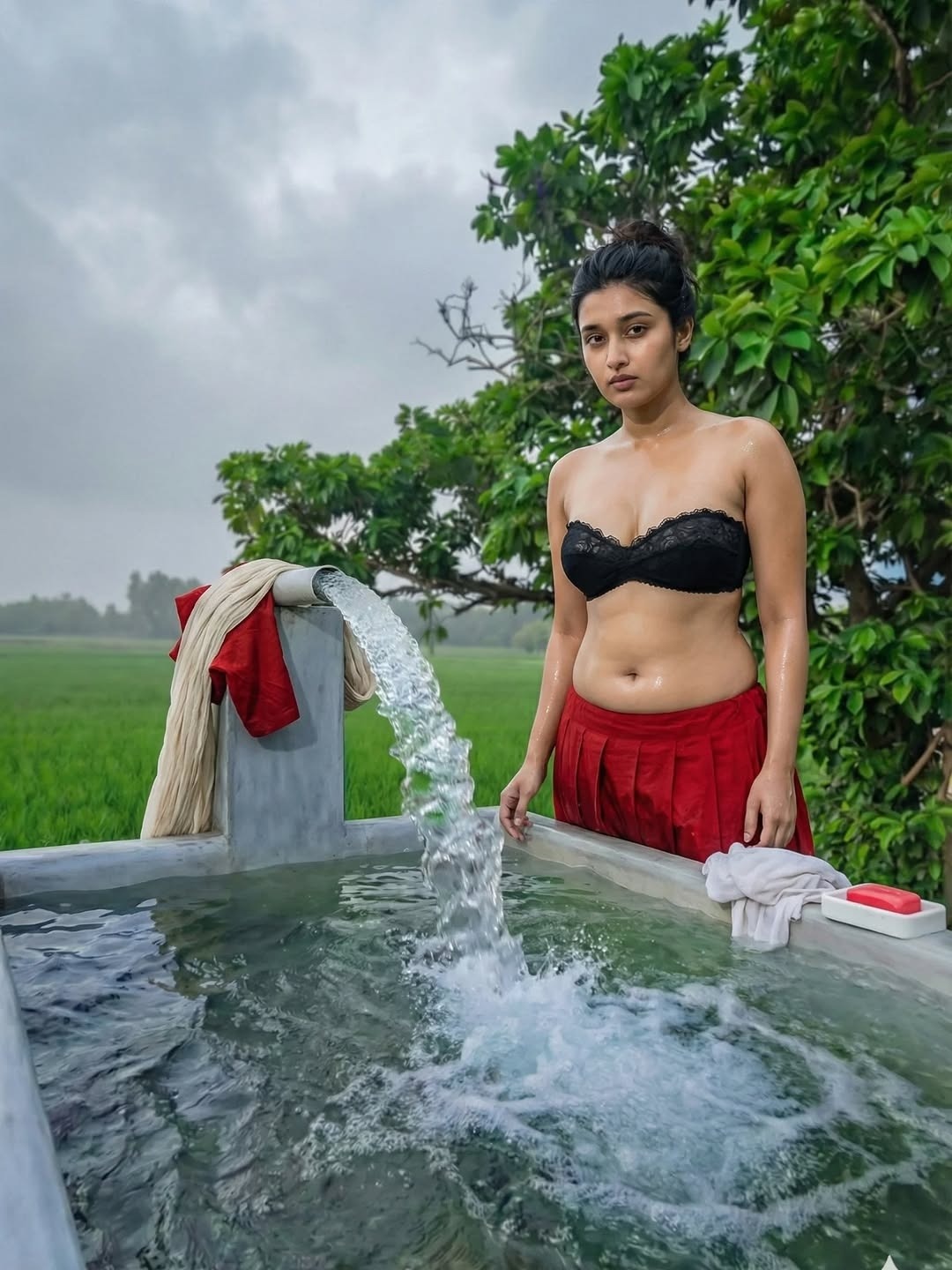 Pumpset padmini is an AI generated photo story posted recently in insta fans page by an insta user aishitha. In this photo story, a beautiful village girl padmini bathing in village pumpset making romance with an oldman (stranger). Padmini looks so hot in red skirt and strapless bikini top, exposing her toned physique, beautiful navel and cute facial expressions to her fans. Here let me post some of these gorgeous photos of pumpset padmini for your viewing pleasure friends.