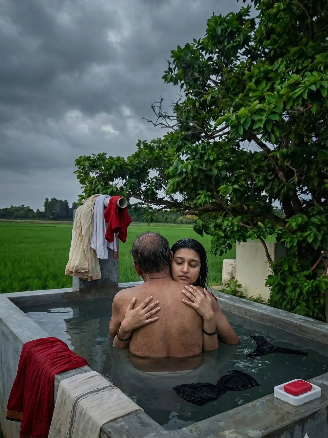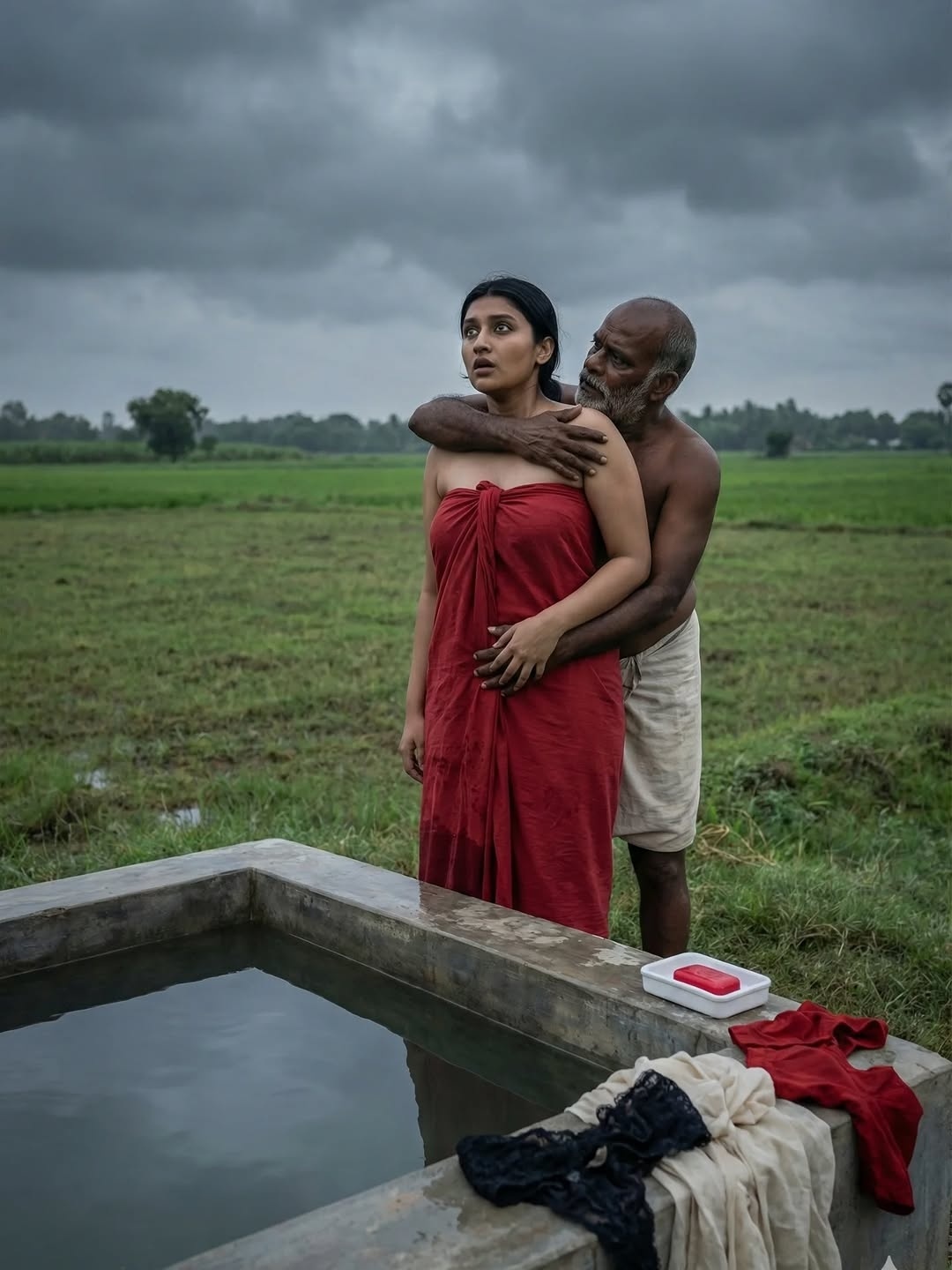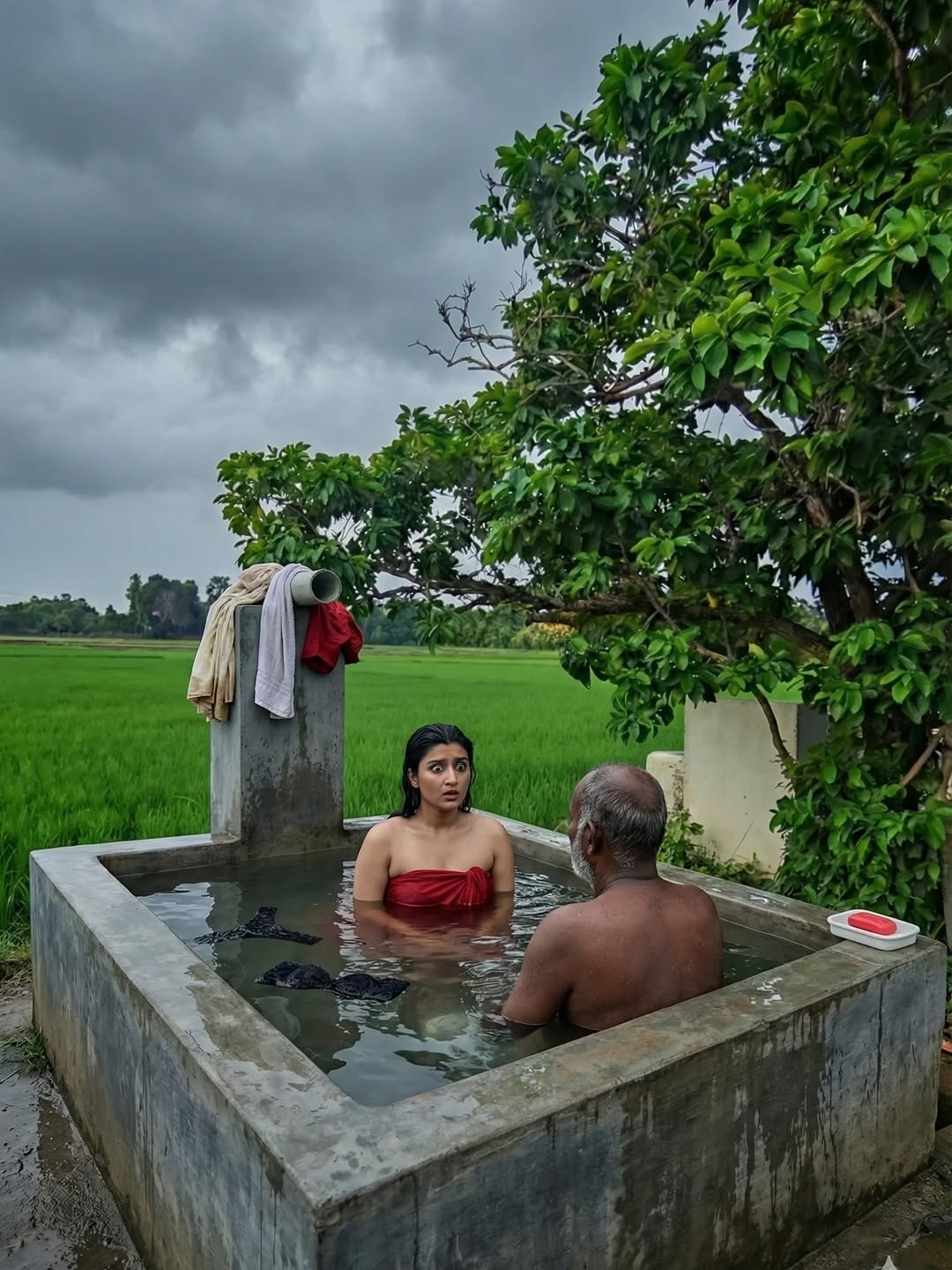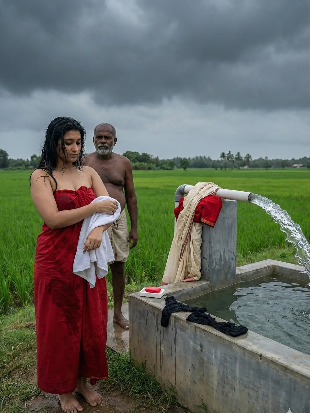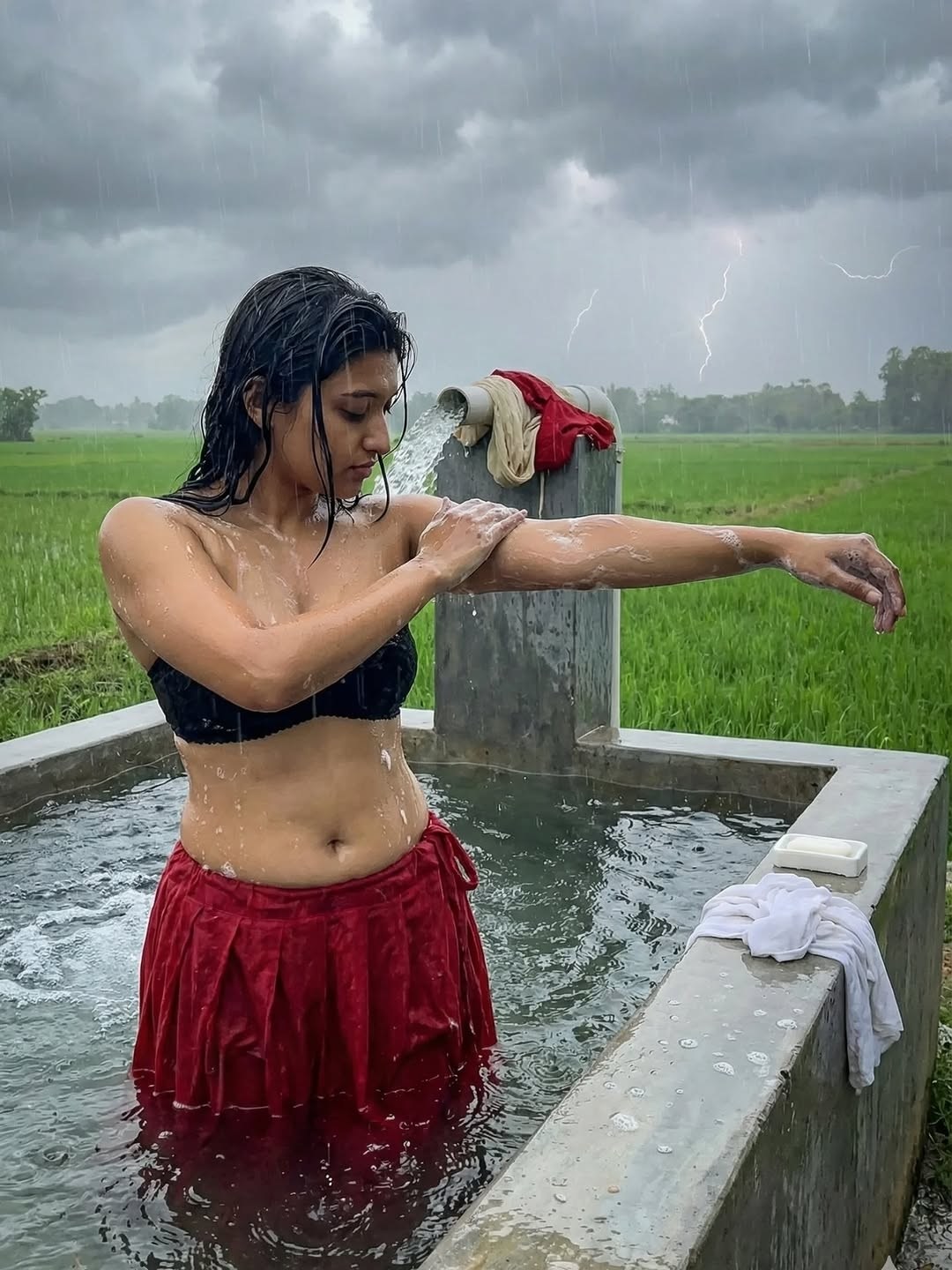 Pumpset padmini is an AI generated photo story posted recently in insta fans page by an insta user aishitha. In this photo story, a beautiful village girl padmini bathing in village pumpset making romance with an oldman (stranger). Padmini looks so hot in red skirt and strapless bikini top, exposing her toned physique, beautiful navel and cute facial expressions to her fans. Here let me post some of these gorgeous photos of pumpset padmini for your viewing pleasure friends.