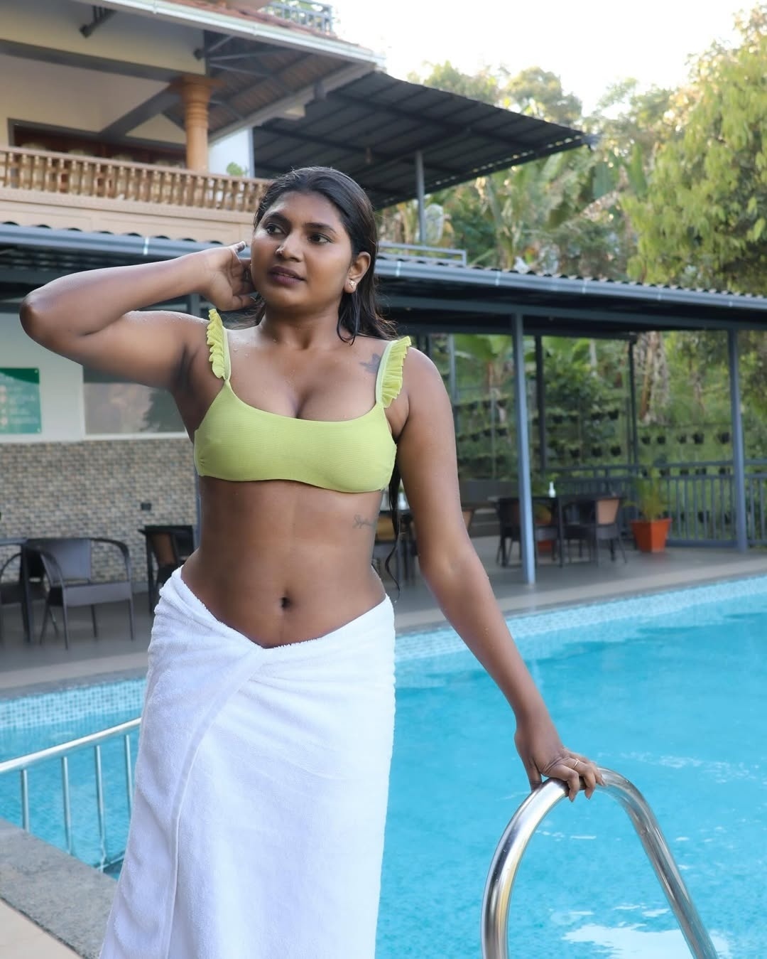 Stephina alex, age 28, born and raised in tirunelveli, is one of the popular fashion & fitness model, insta star & social media influencer. Recently stephina alex dressed up in a hot gree color bralette top and white saree like skirt & gave some spicy poses in a swimming pool. In these captivating photos, stephina alex exposed her dusky navel to her fans. Here let me post some of these gorgeous navel photos of stephina alex. Enjoy her hotness guys.
