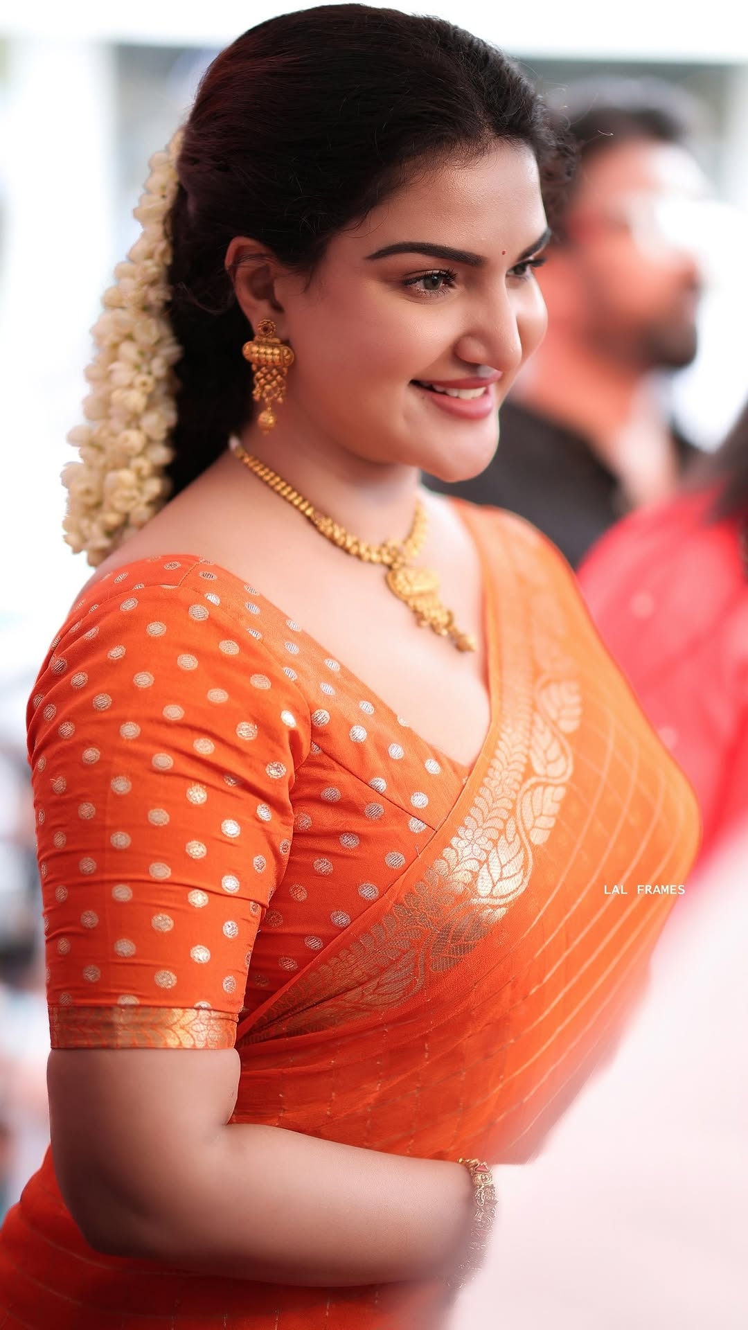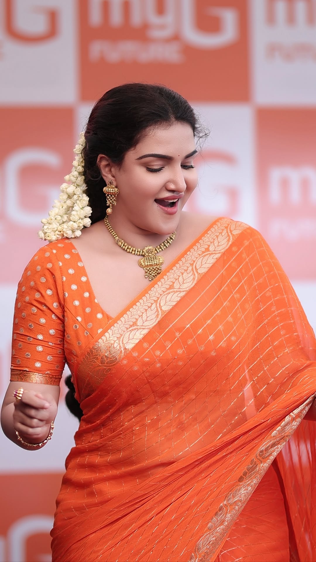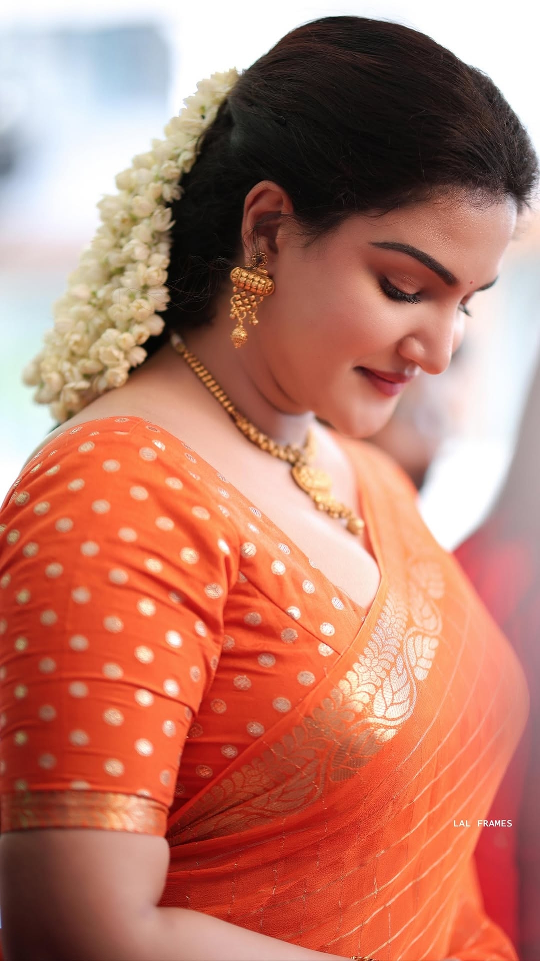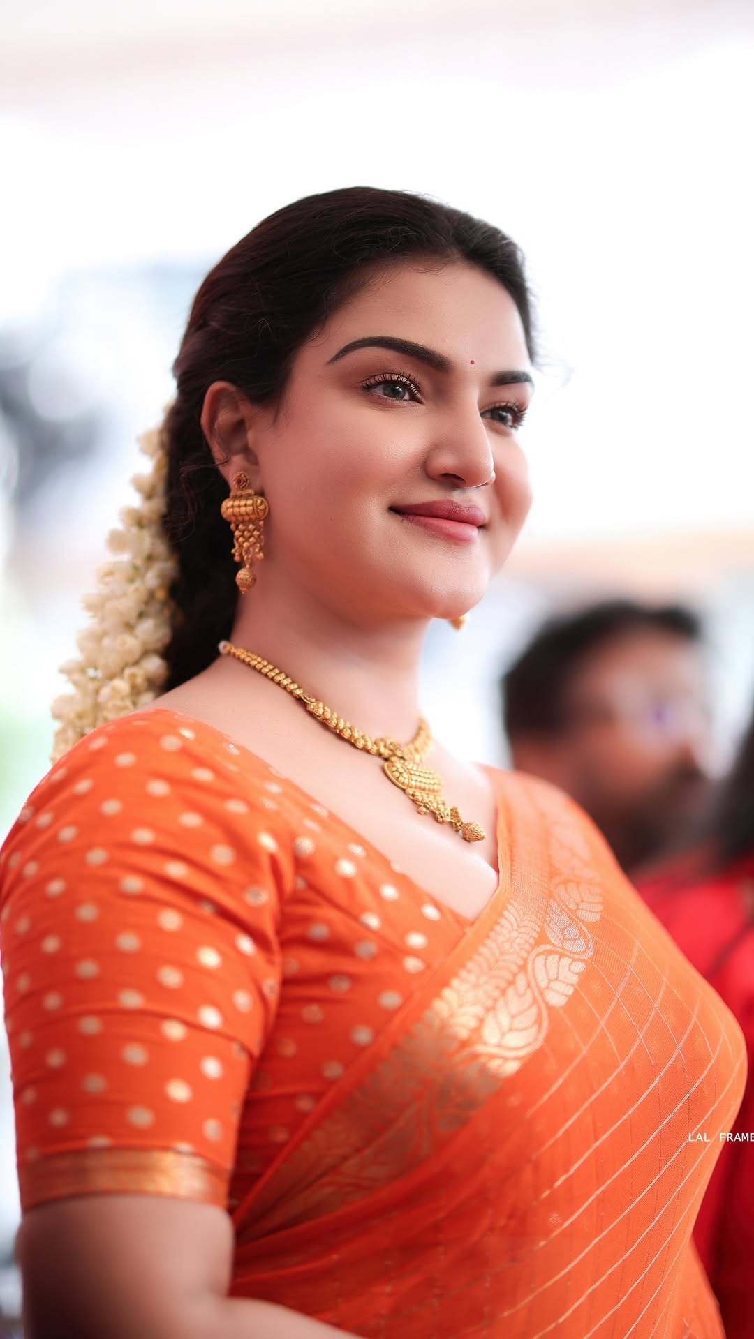 Honey Rose Varghese is a leading Malayalam film actress from Kerala. She has also played heroine roles in a few Telugu and Tamil films. At a private event held in Kochi, Honey Rose appeared in an orange saree, looking stunningly beautiful with a slightly chubby charm. I’ve uploaded some of her hot photos from the event here, enjoy viewing them, friends!