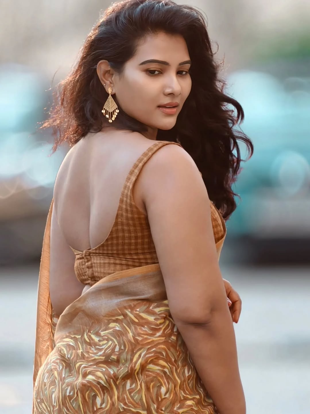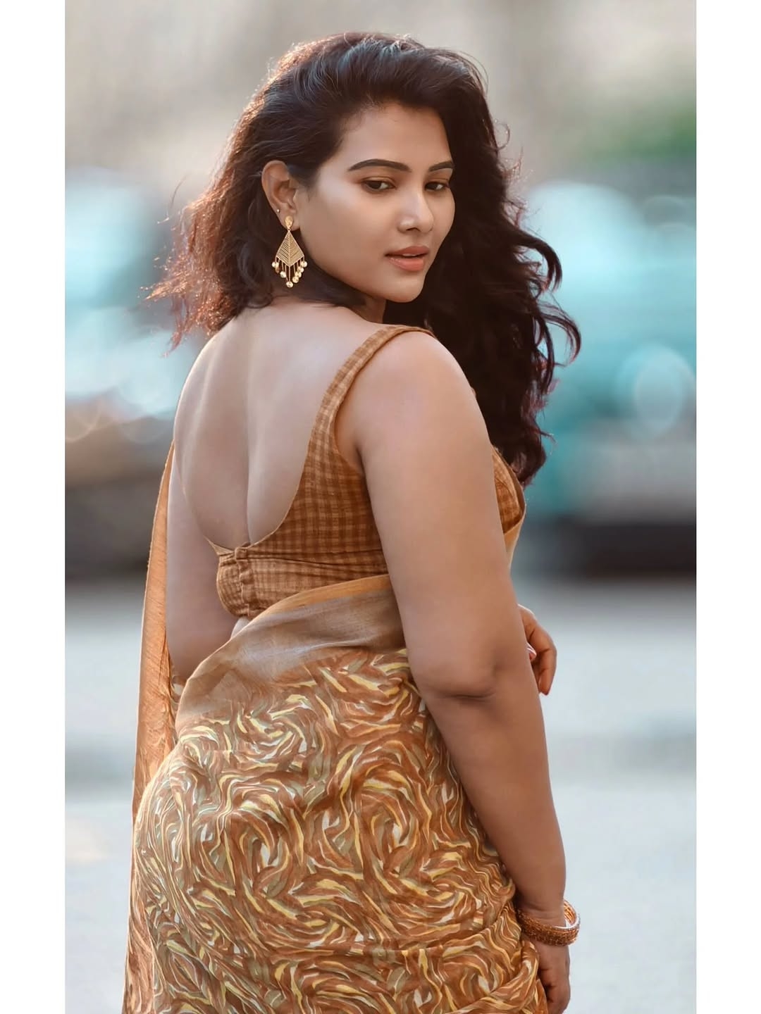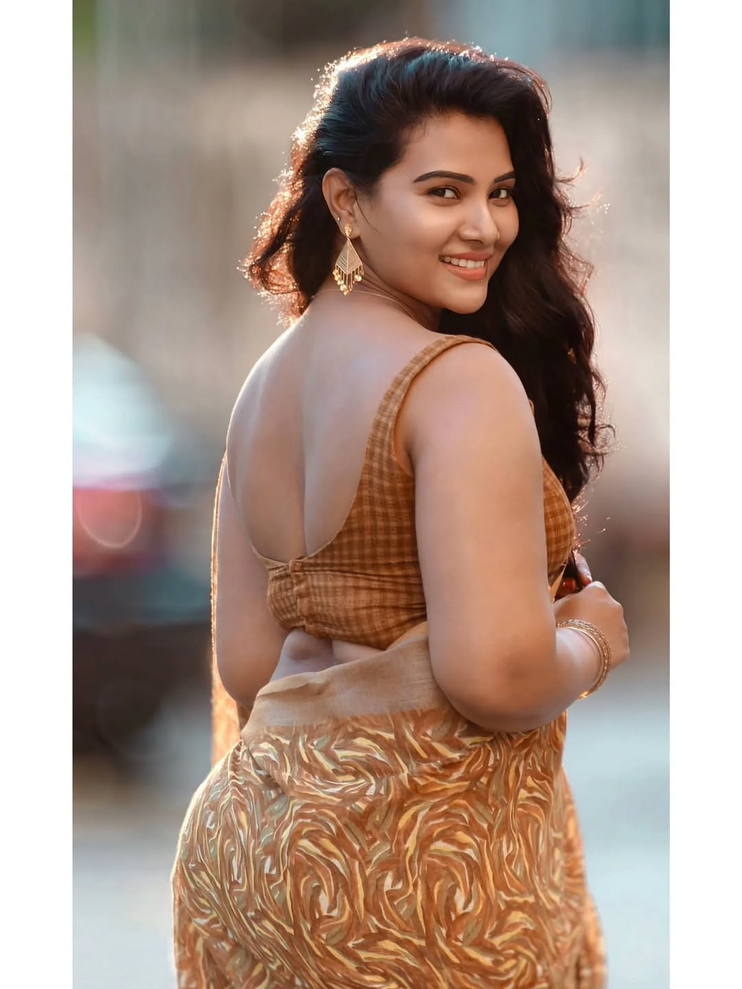 Dhivya Duraisamy, who began her career as a news anchor in Tamil television, has since made waves as an actress and model in both cinema and the small screen. A few days ago, she uploaded stunning photos to her social media, where she’s seen in a sleeveless, bare-back saree. With a slightly curvy frame and youthful aunty charm, Dhivya looks absolutely gorgeous in these pictures. Enjoy the visual treat, guys!