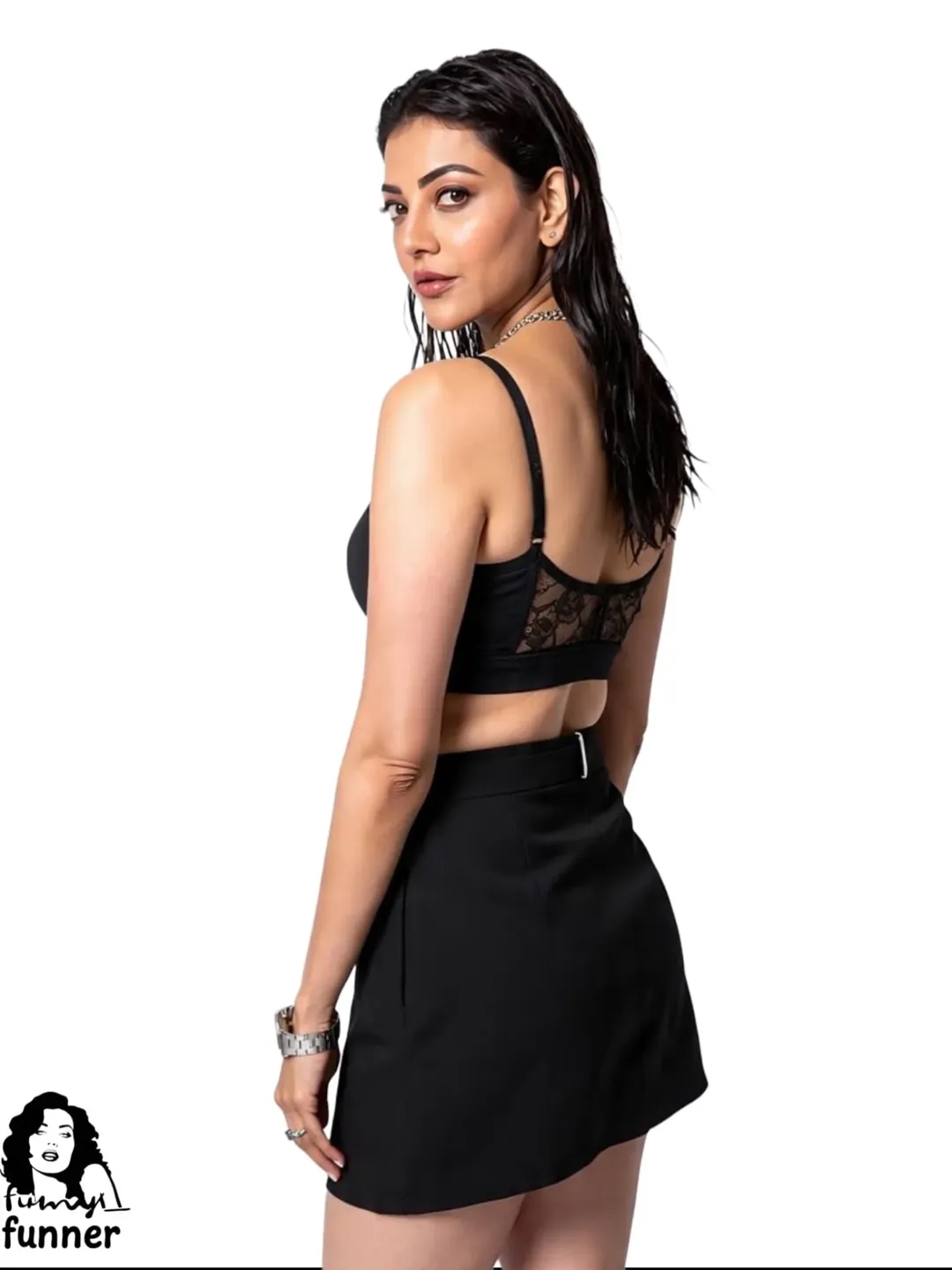 Kajal Aggarwal hot pose in a black short top and mini skirt.