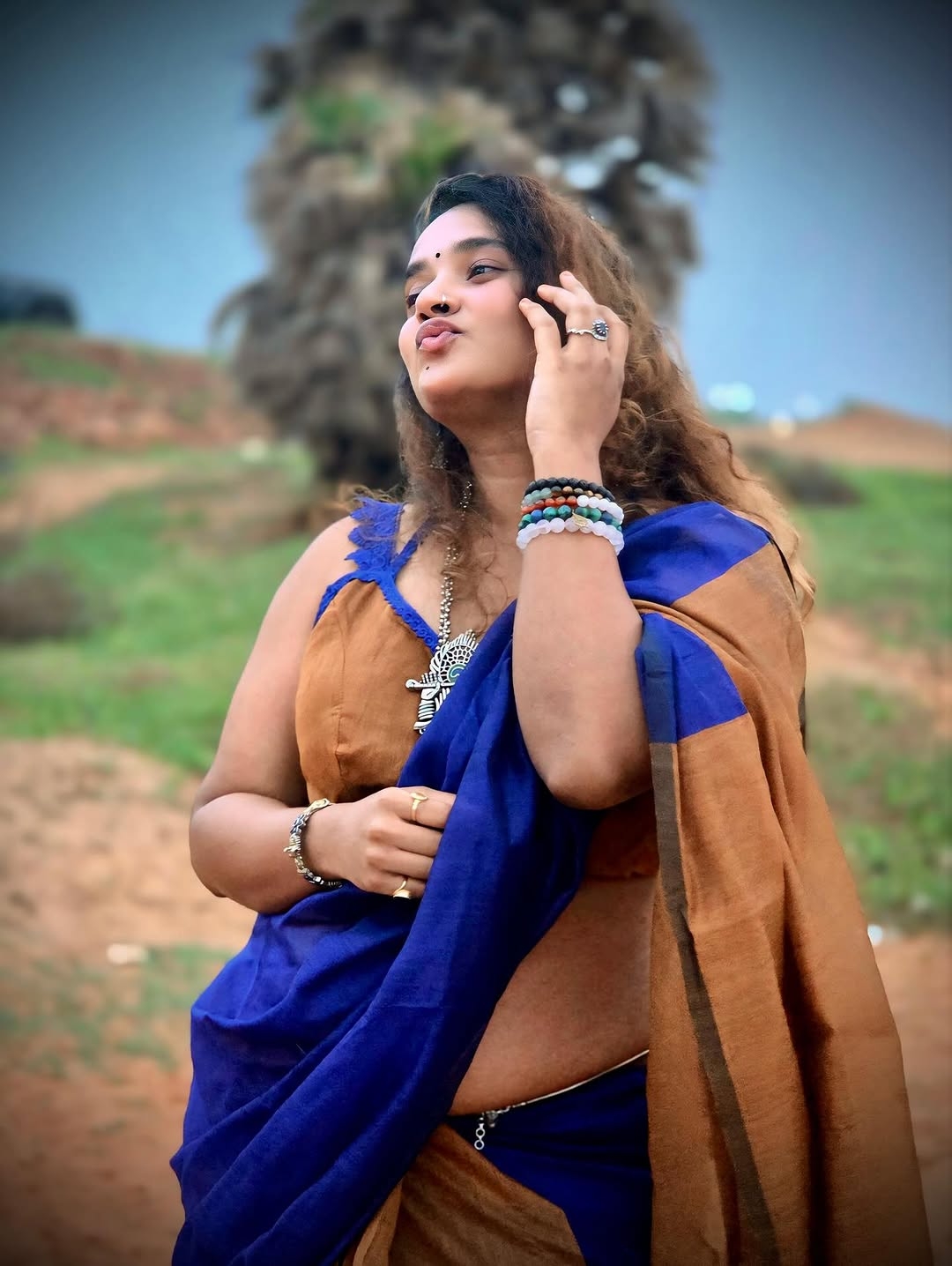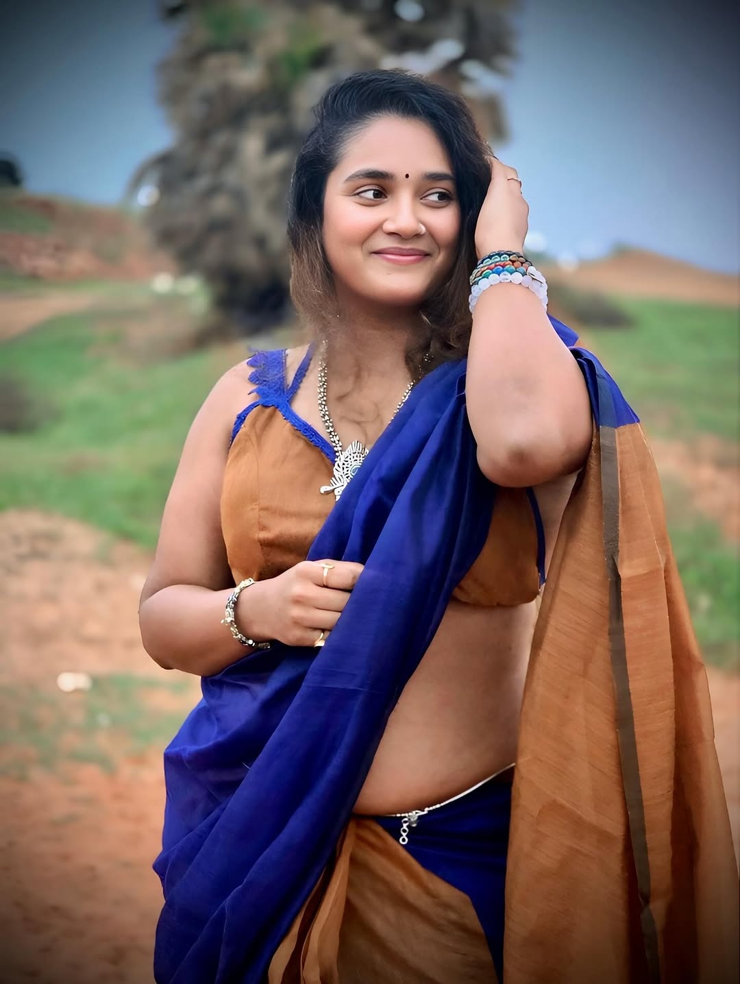 Soumya shetty somu dragged her saree pallu to flaunt her chubby navel..