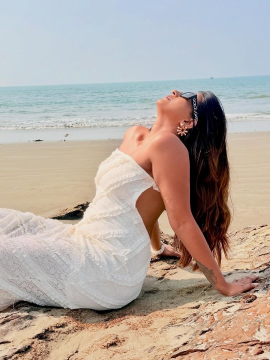 3608500cookie-checkRisha gowda hot beach photos in strapless white gown..