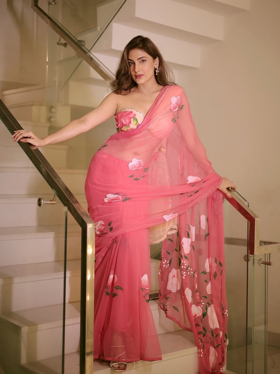 Reena Aggarwal showcasing her cleavage and navel in a strapless top and transparent saree.