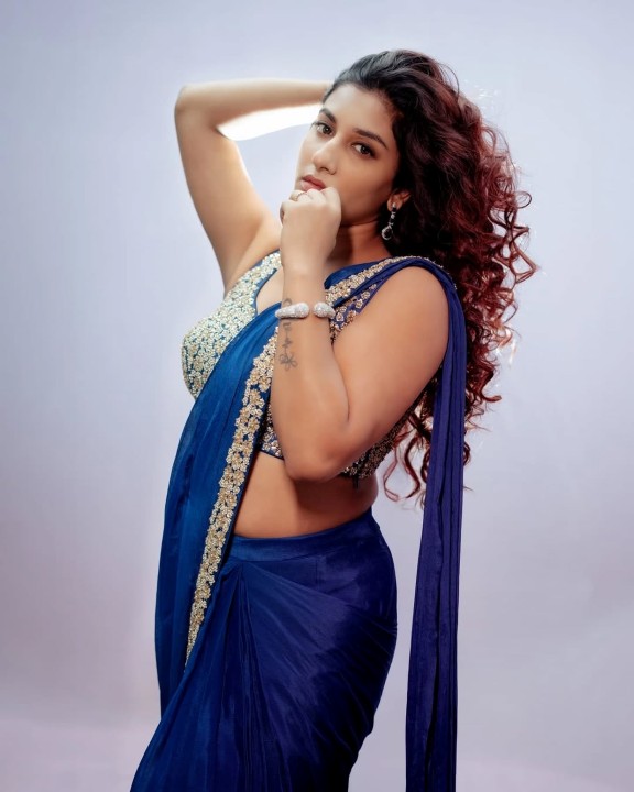 Vishnupriya bhimeneni continously posing hot in exclusive photoshoot to retain her market and to get new movie projects. Recently, the telugu tv actress and movie actress vishnupriya bhimeneni struck a hot pose in a low neck sleeveless blue saree. Vishnupriya flaunted her chubby navel and cleavage to her fans in these hot saree photos. Here let me post some of these gorgeous low neck blue saree photos of actress vishnu priya bhimeneni. Enjoy her hotness guys.