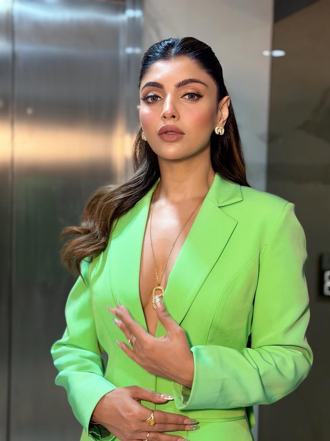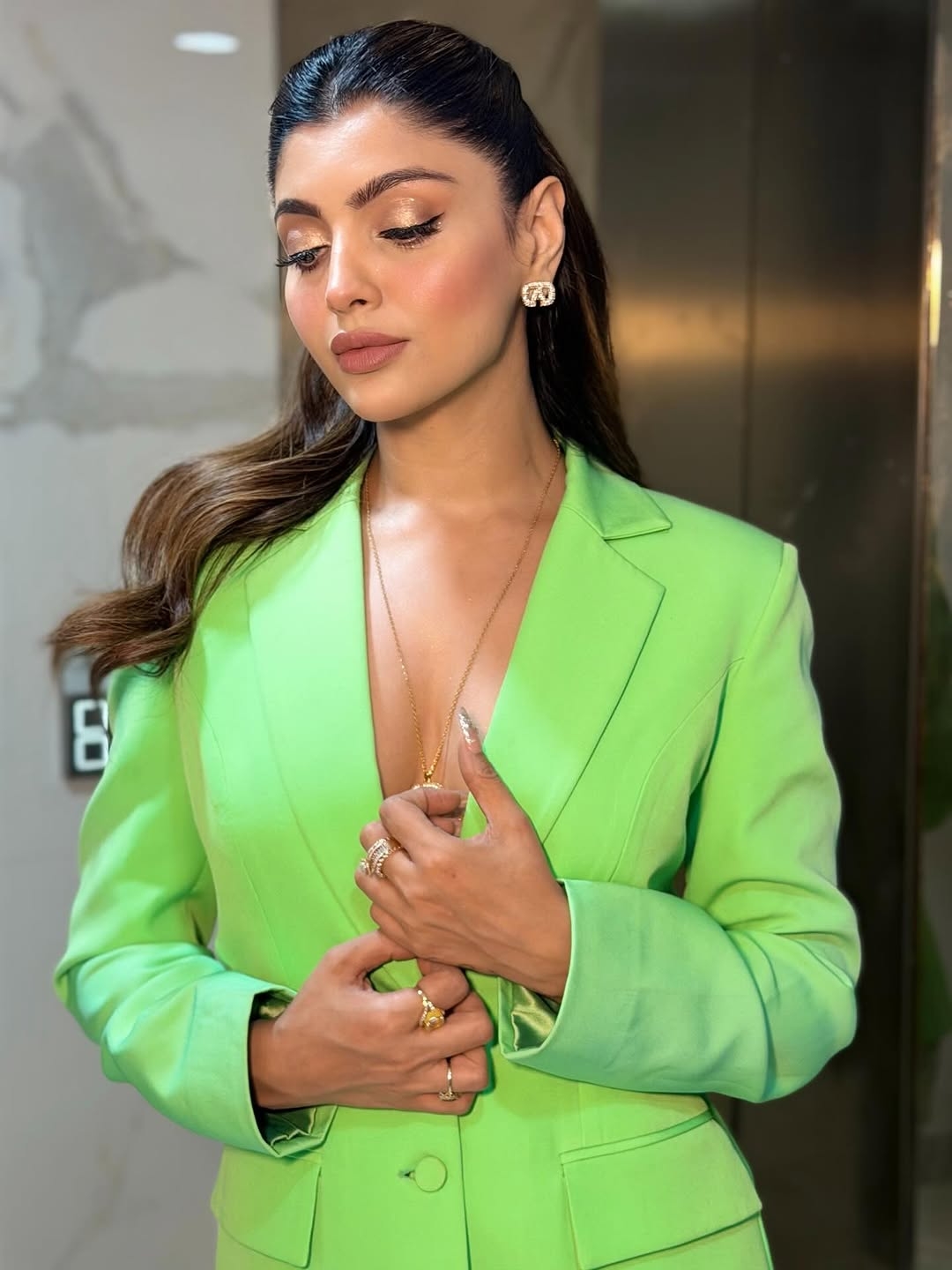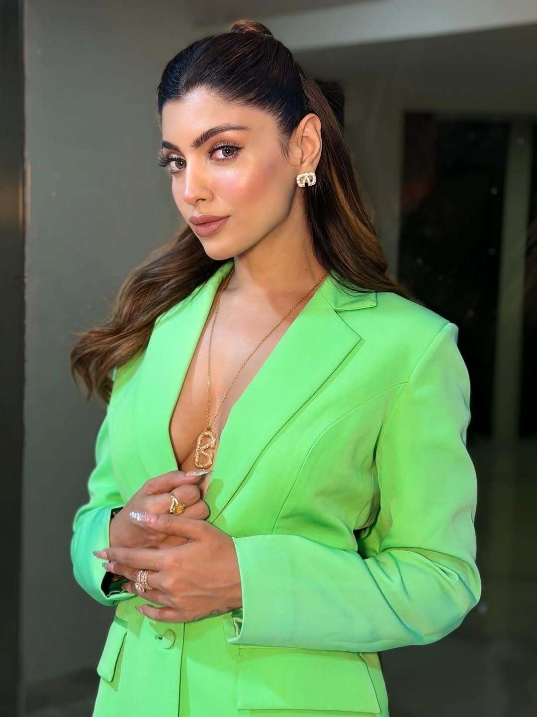 3654210cookie-checkAkanksha puri hot cleavage exposed in green deep v neck blazer style coat..