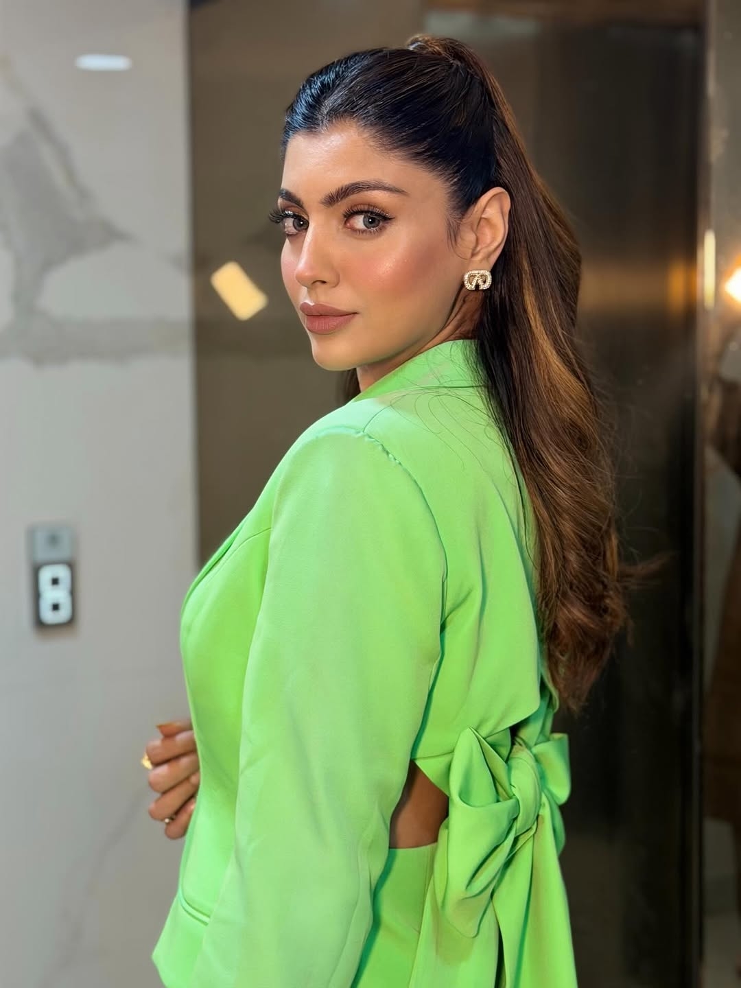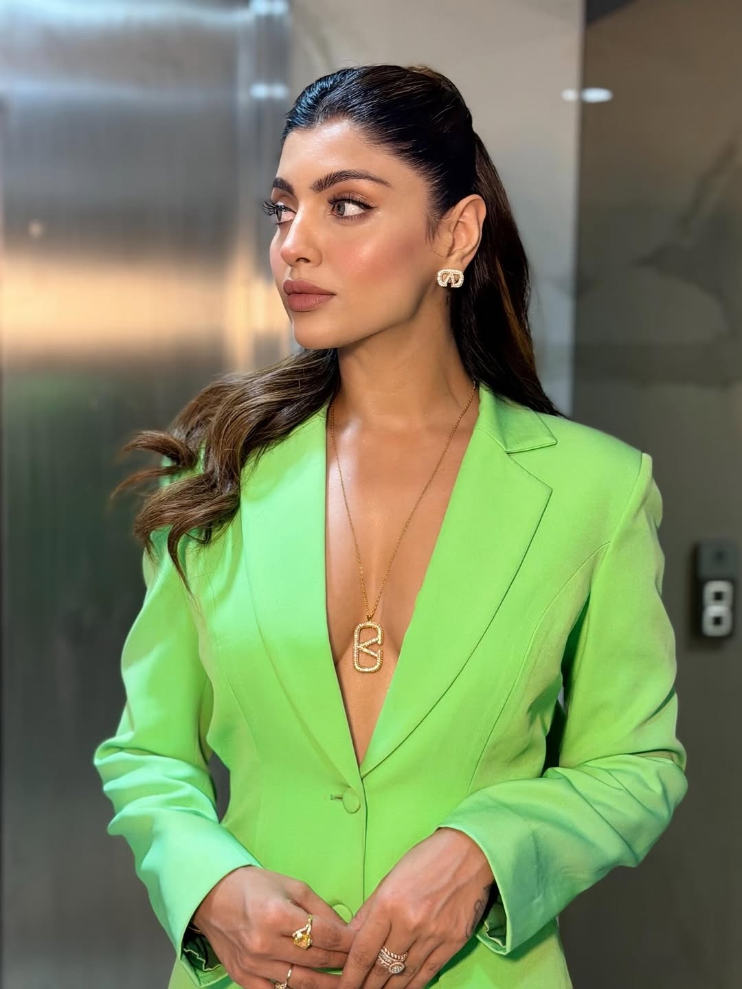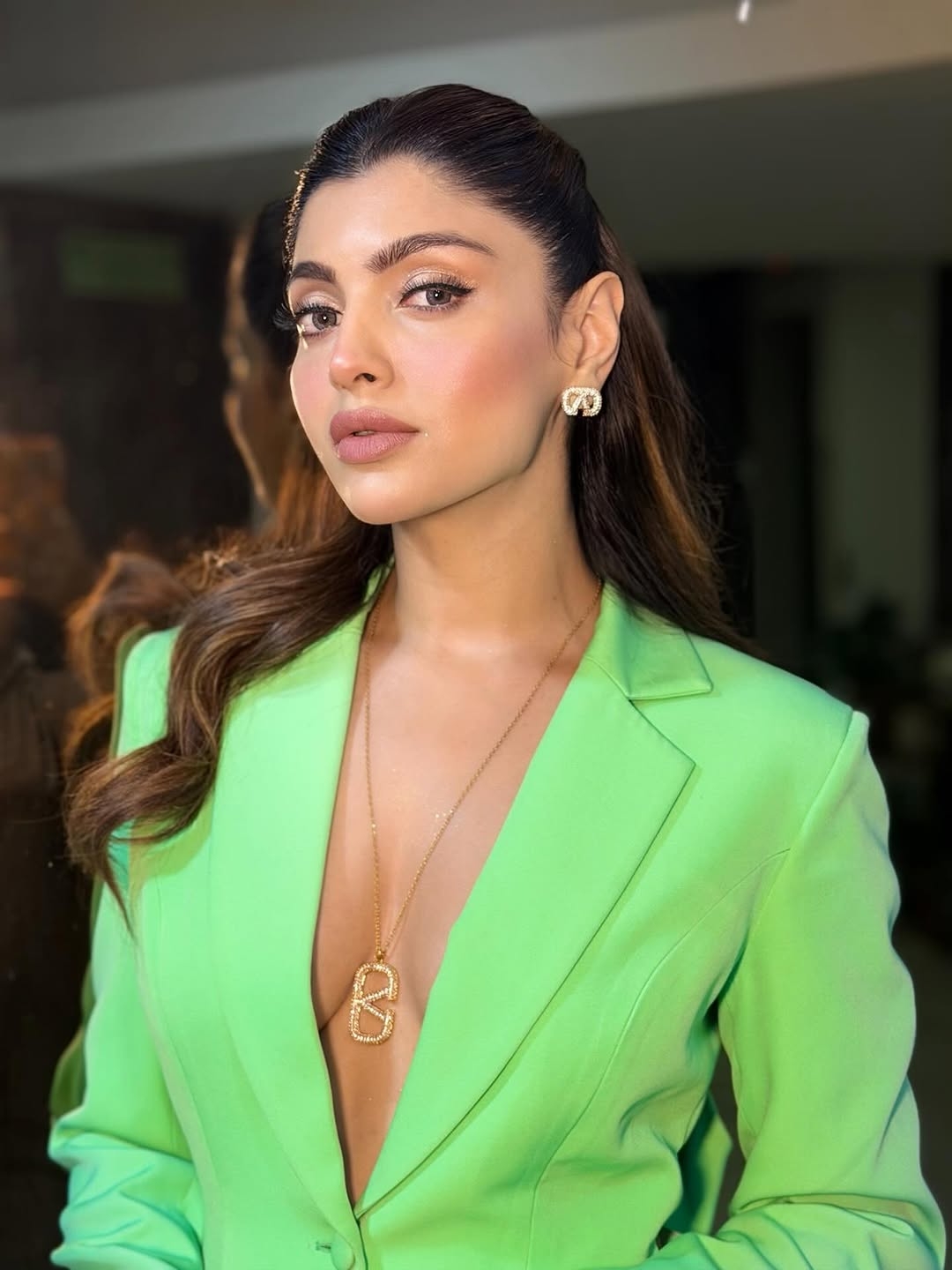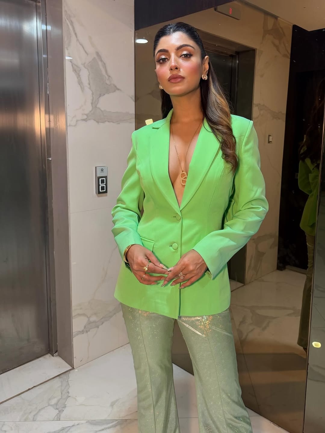 3654210cookie-checkAkanksha puri hot cleavage exposed in green deep v neck blazer style coat..